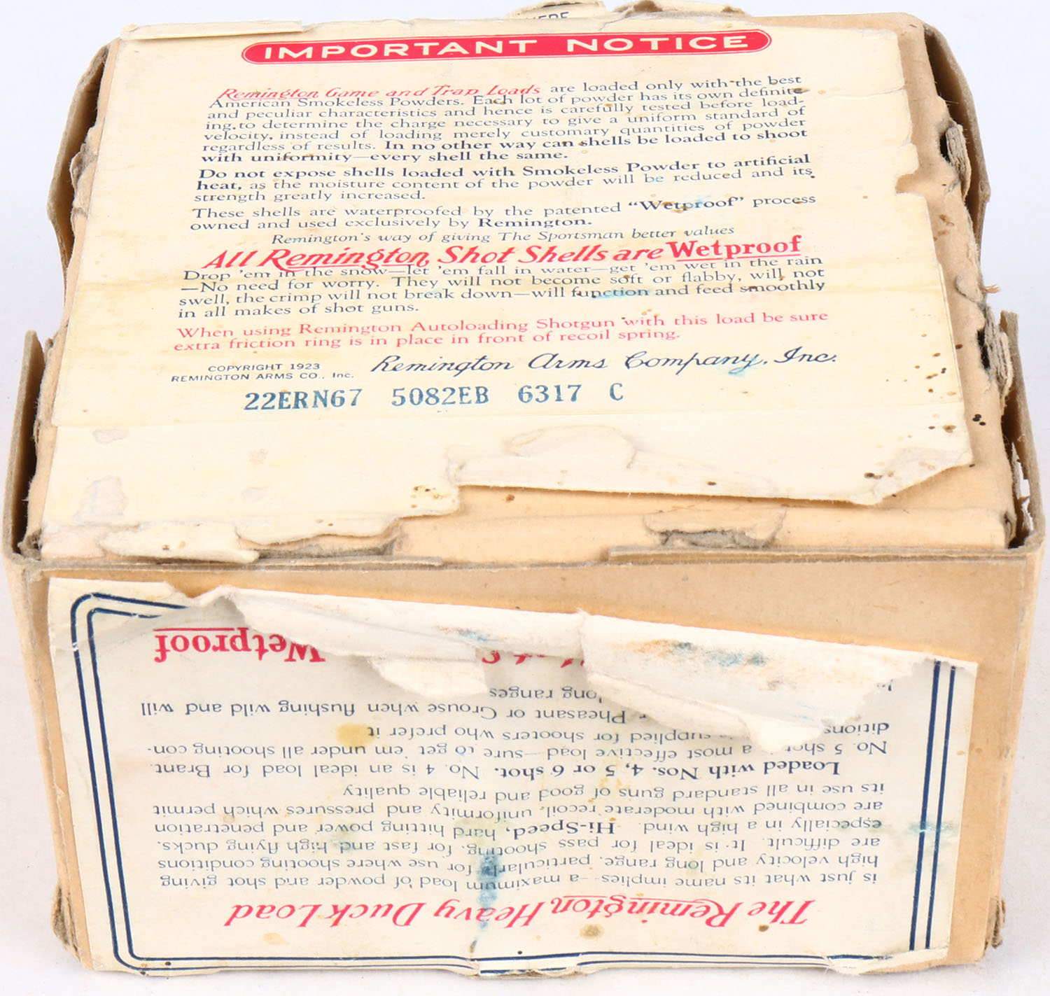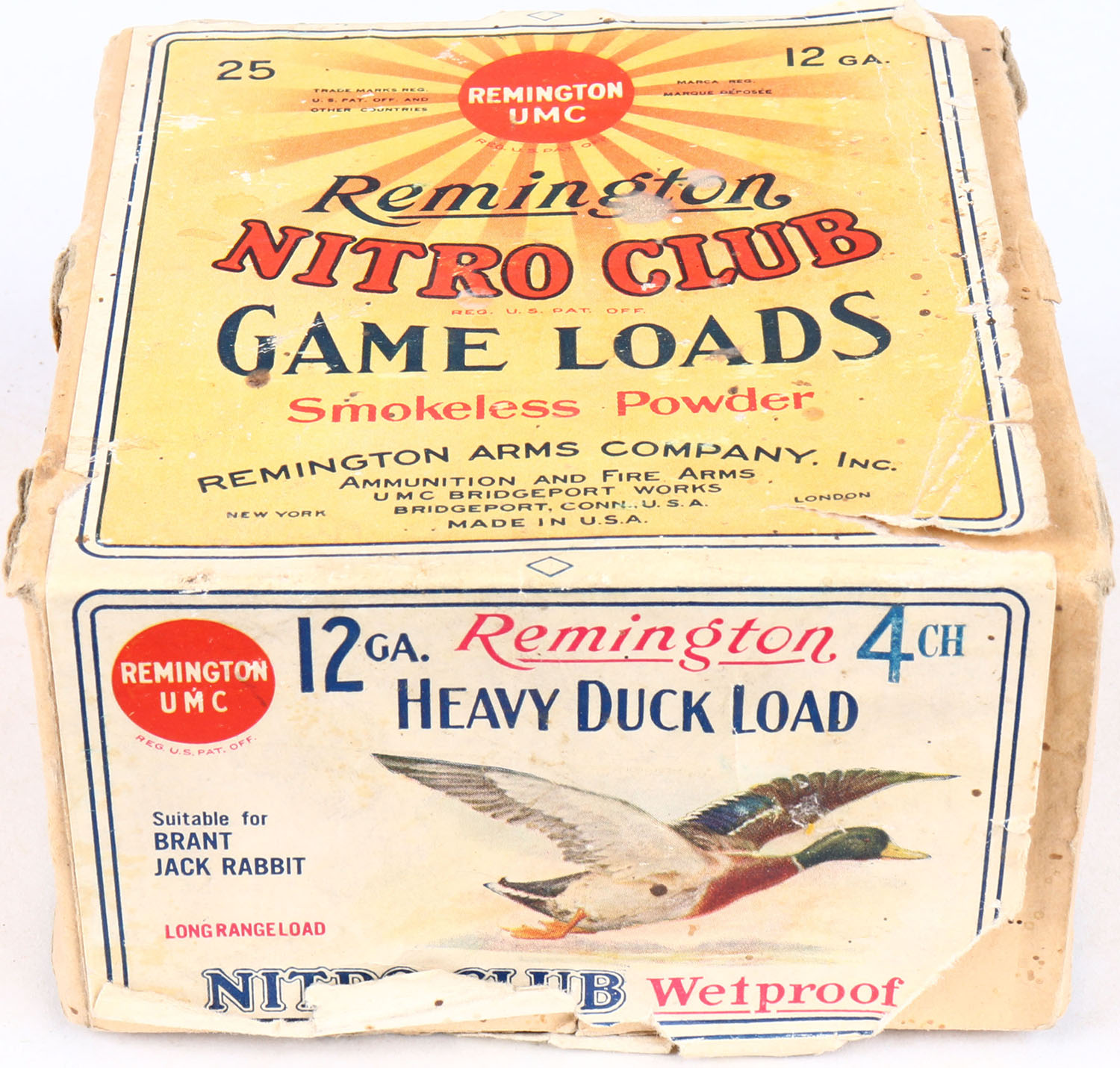 REM UMC Nitro Club Game Loads, 12ga, 2pc., Empty, shot size 4 CH, buff box with sunburst logo and a mallard on side, box has shell protrusions, light soiling with very nice colors. Grade: Very Good ++ - Value: 100 to 400