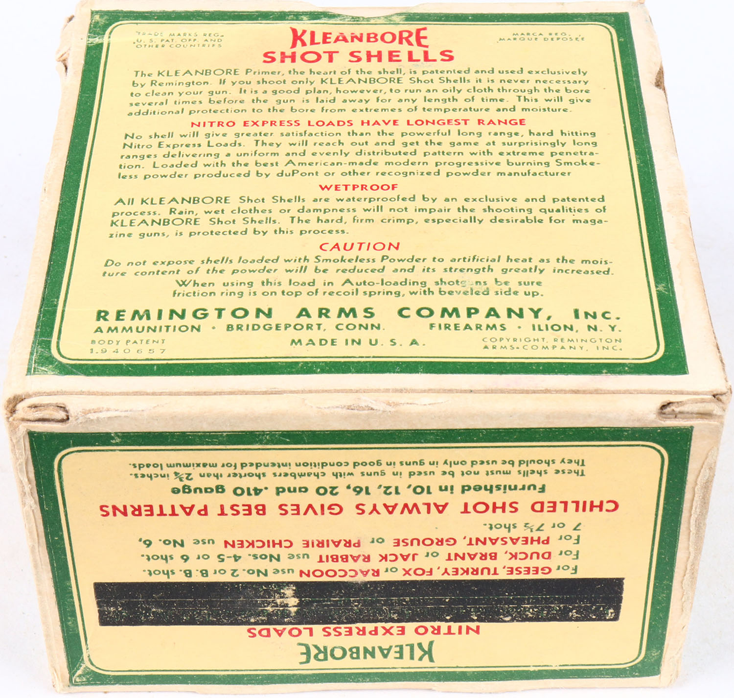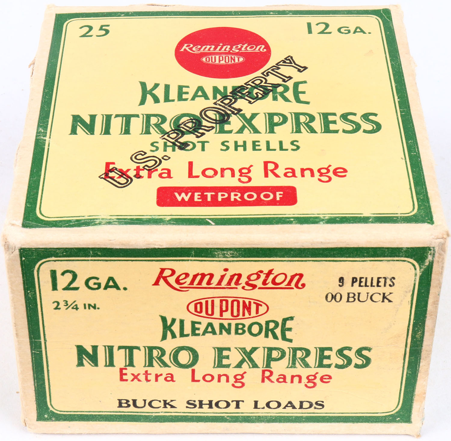Remington, Kleanbore, US PROPERTY, NITRO EXPRESS, 1pc., Full, shot size 00 BUCK Shot Loads, box is yellow, red and green, box is solid with small shell protrusions, shells are good. Grade: Excellent + - Value: 20 to 60