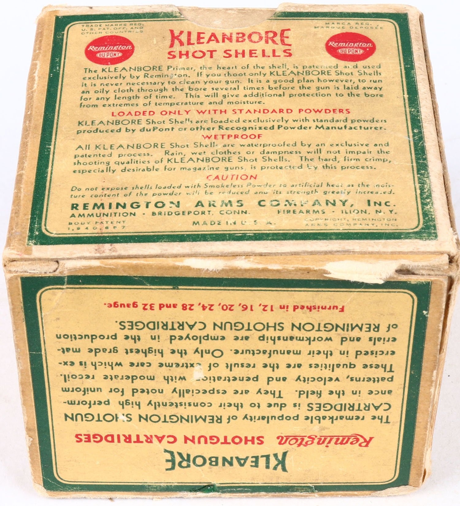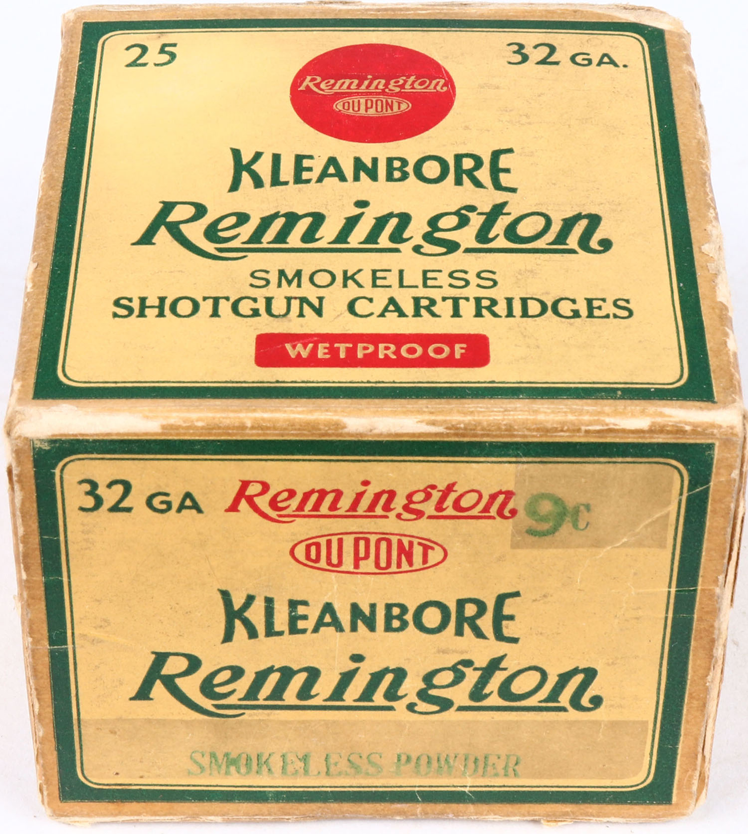Remington, Kleanbore, Kleanbore, 32ga., 1pc., Full, shot size 9C, box is yellow, red and green, box is solid with excellent color, light edge wear, light soiling, shells are excellent. Grade: Excellent - Value: 20 to 500