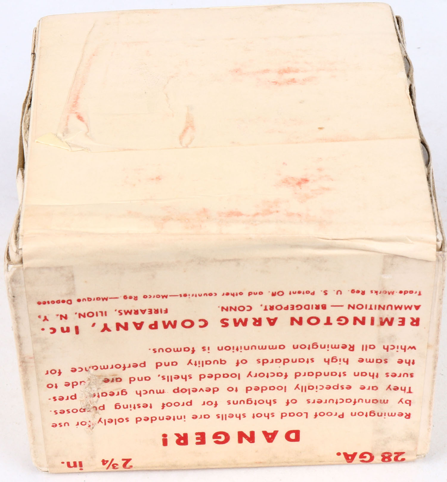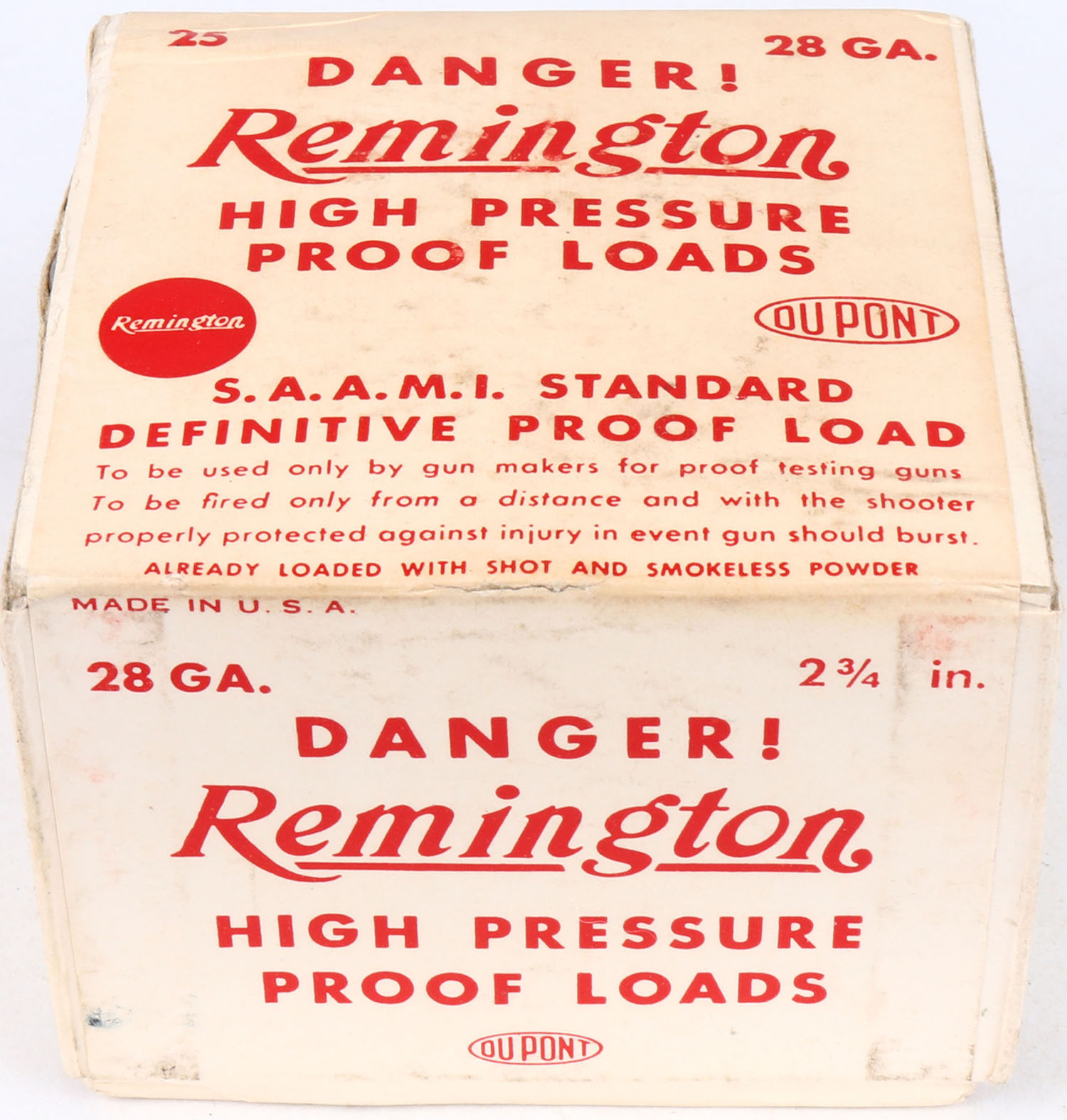 Remington, Kleanbore, 28ga., 2pc., FULL & SEALED, High Pressure Proof Loads, buff box with white & red label, box is very solid with shell protrusion & light soiling has excellent label. Grade: Excellent + - Value: 50 to 300