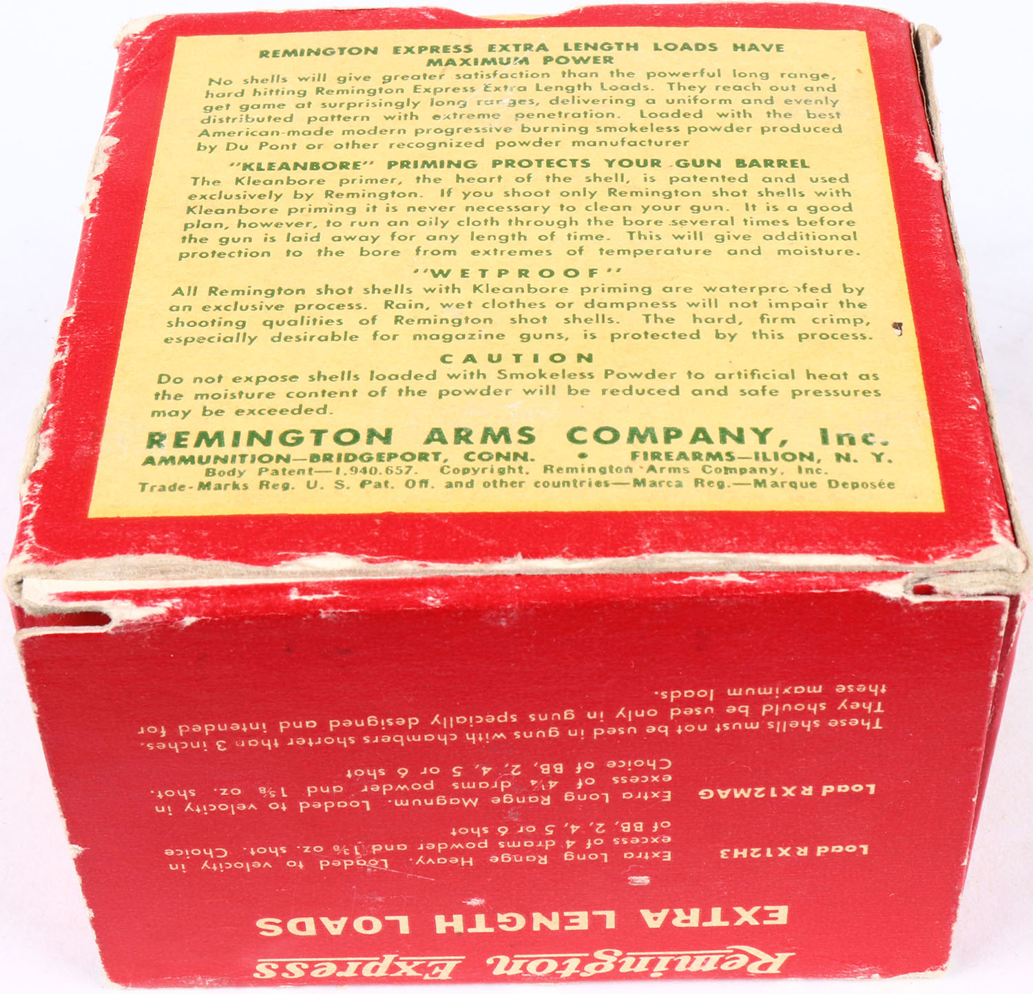 Remington, Kleanbore Express Magnum, 12ga., 1pc., Full, shot size 2 Magnum, red, white and green box, 3'', box is solid with edge wear, tape repair & has great colors, shells are excellent. Grade: Excellent - Value: 10 to 30