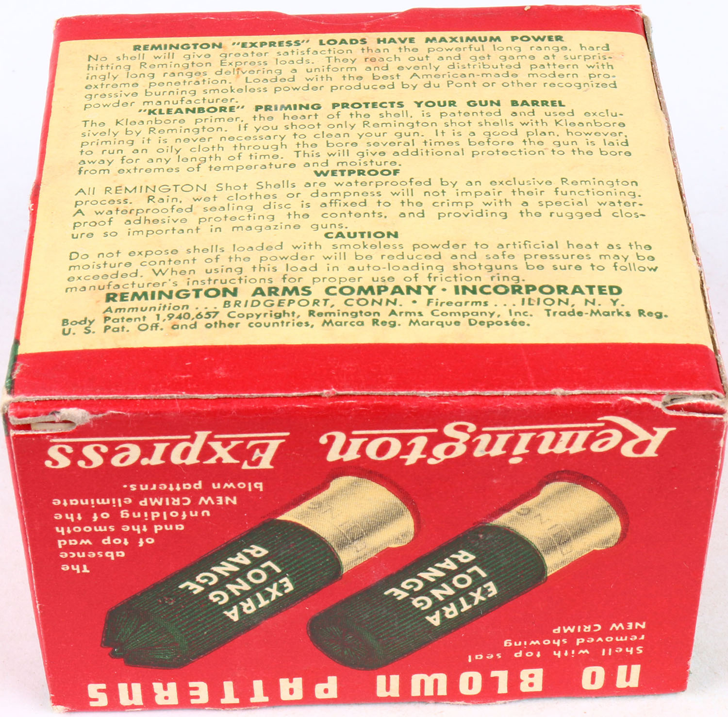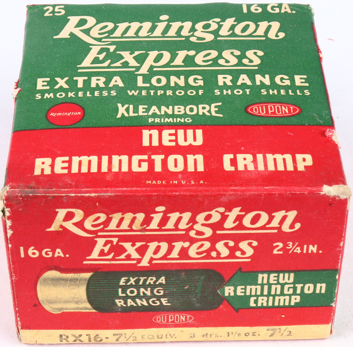 Remington, Express Kleanbore, 16ga., 2 3/4'', 1pc., Full, shot size 7 1/2, box is red, white and green, box is solid with great colors, shells are poor. Grade: Very Good ++ - Value: 4 to 20