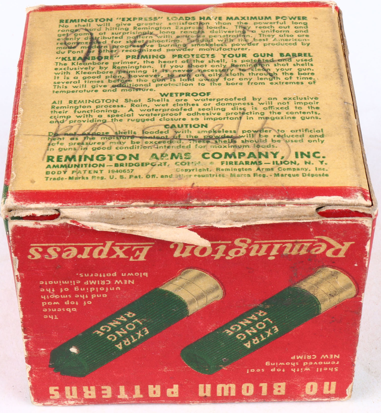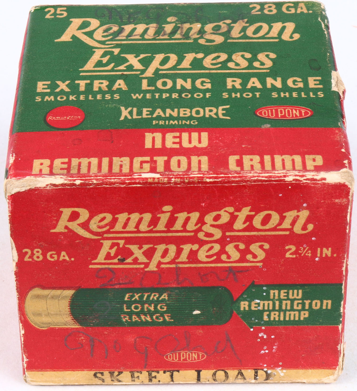 Remington, Express Extra Long Range, 28ga., 1pc., Full, shot size SKEET LOAD 9, red and green box, 2 3/4'', box is solid with nice colors and light edge wear, light soiling, shells are very good. Grade: Very Good ++ - Value: 10 to 30
