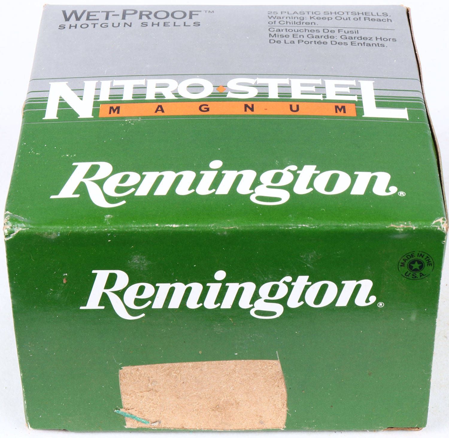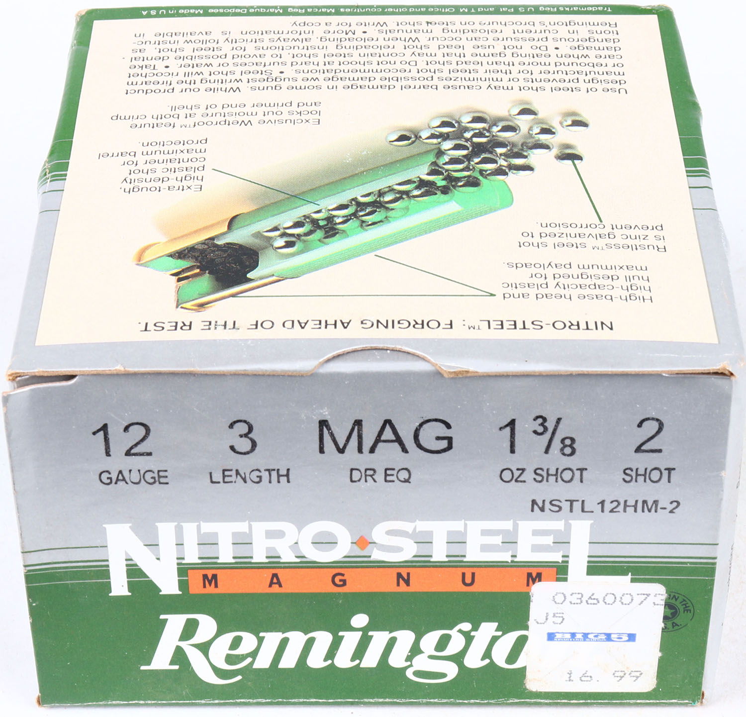 Remington, Nitro Steel Magnum, 12ga., 1pc., Full, shot size 2, multi-colored box, shells are excellent. Grade: Excellent - Value: 10 to 20