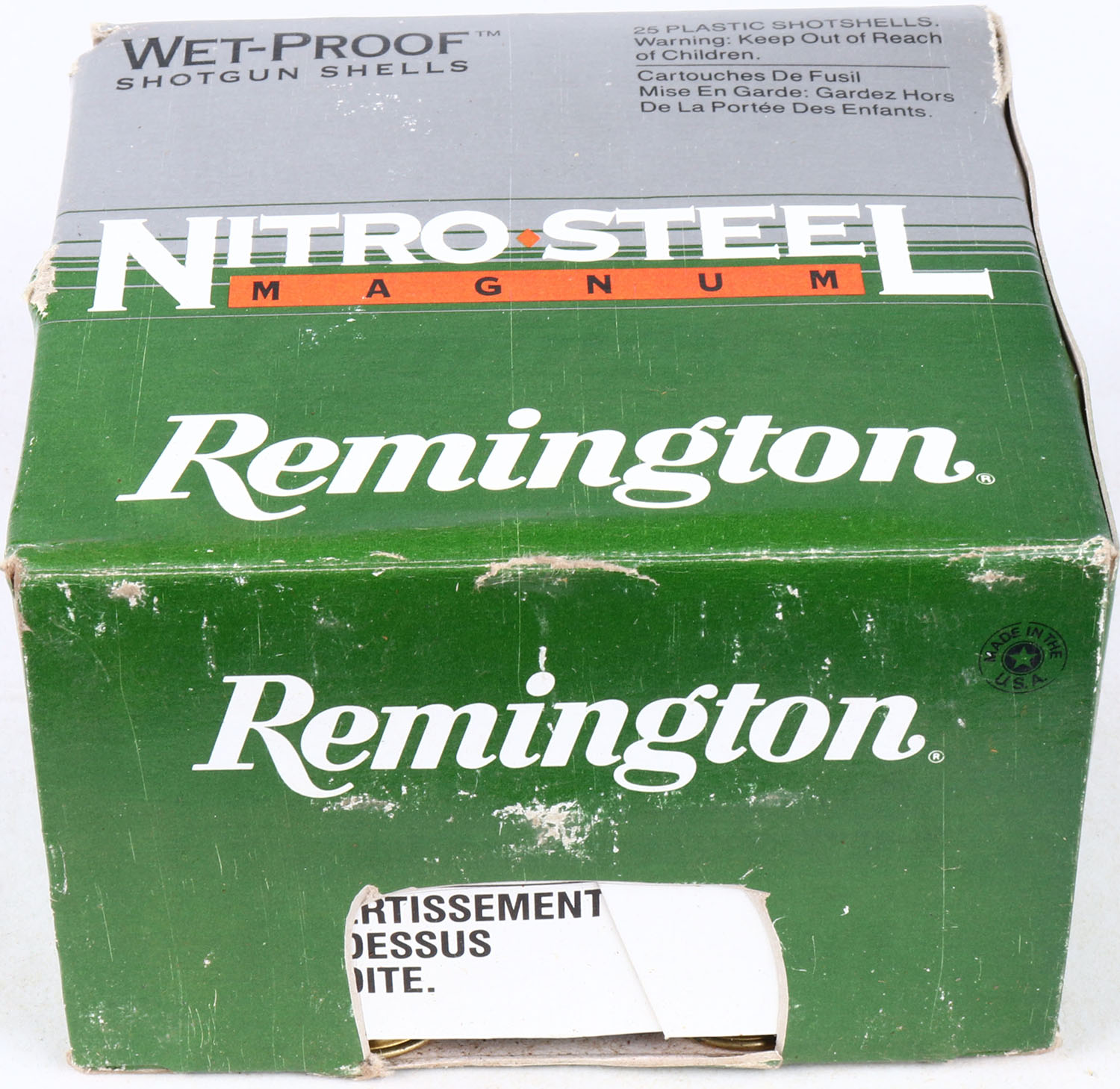 Remington, Nitro Steel Magnum, 12ga., 1pc., Full, shot size 2, multi-colored box, shells are excellent. Grade: Excellent - Value: 10 to 20
