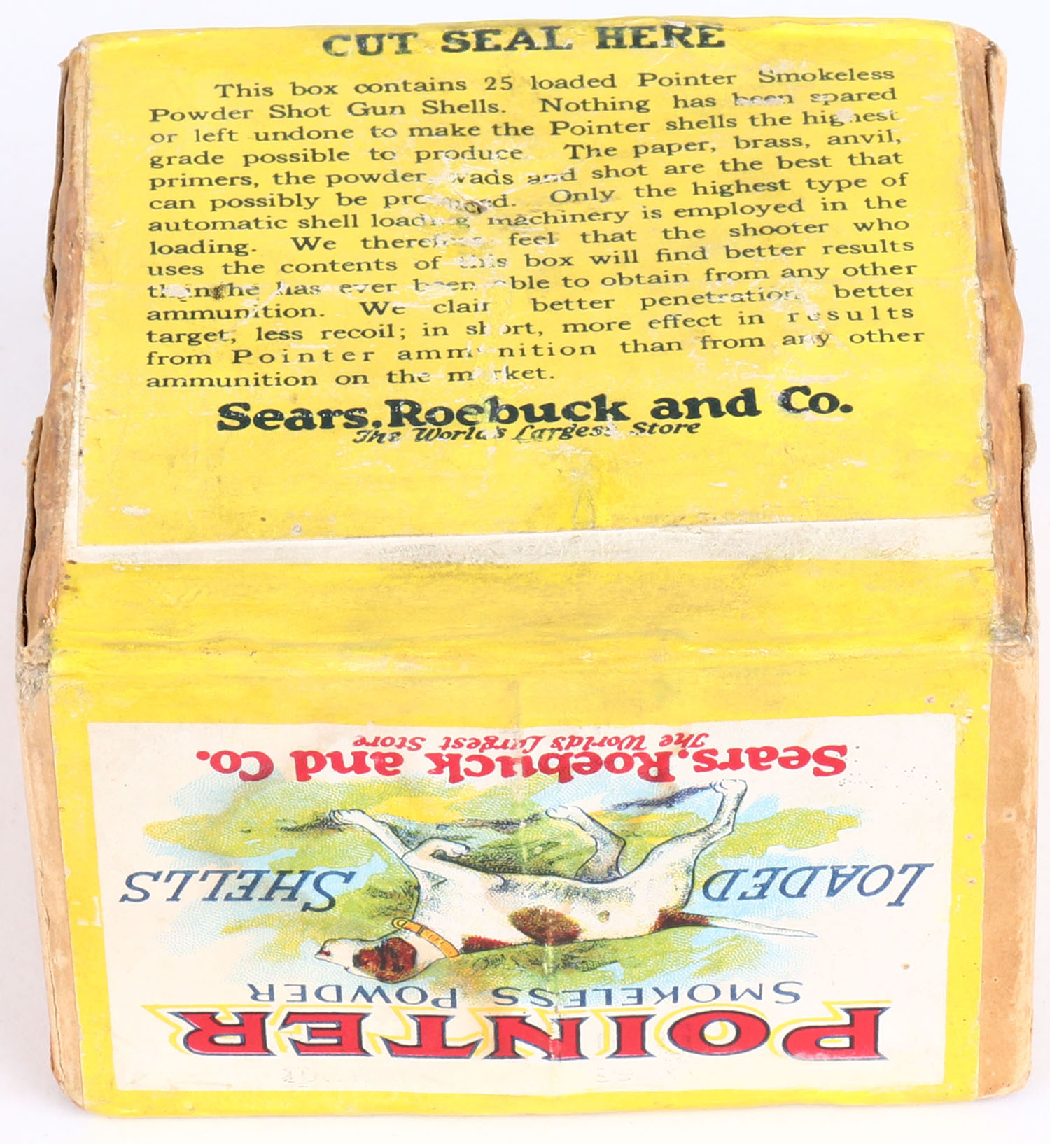 Sears. Roebuck & Co., POINTER, 16ga., 2pc., FULL & Professionally RESEALED, shot size 6, buff box with multi-colored label of a dog holding a quail, box is solid with light soiling, two shell protrusions has very nice label which has been professionally touched up, sides picture crossed shells & a dog on point, label is 100% intact. Grade: Excellent - Value: 300 to 1200