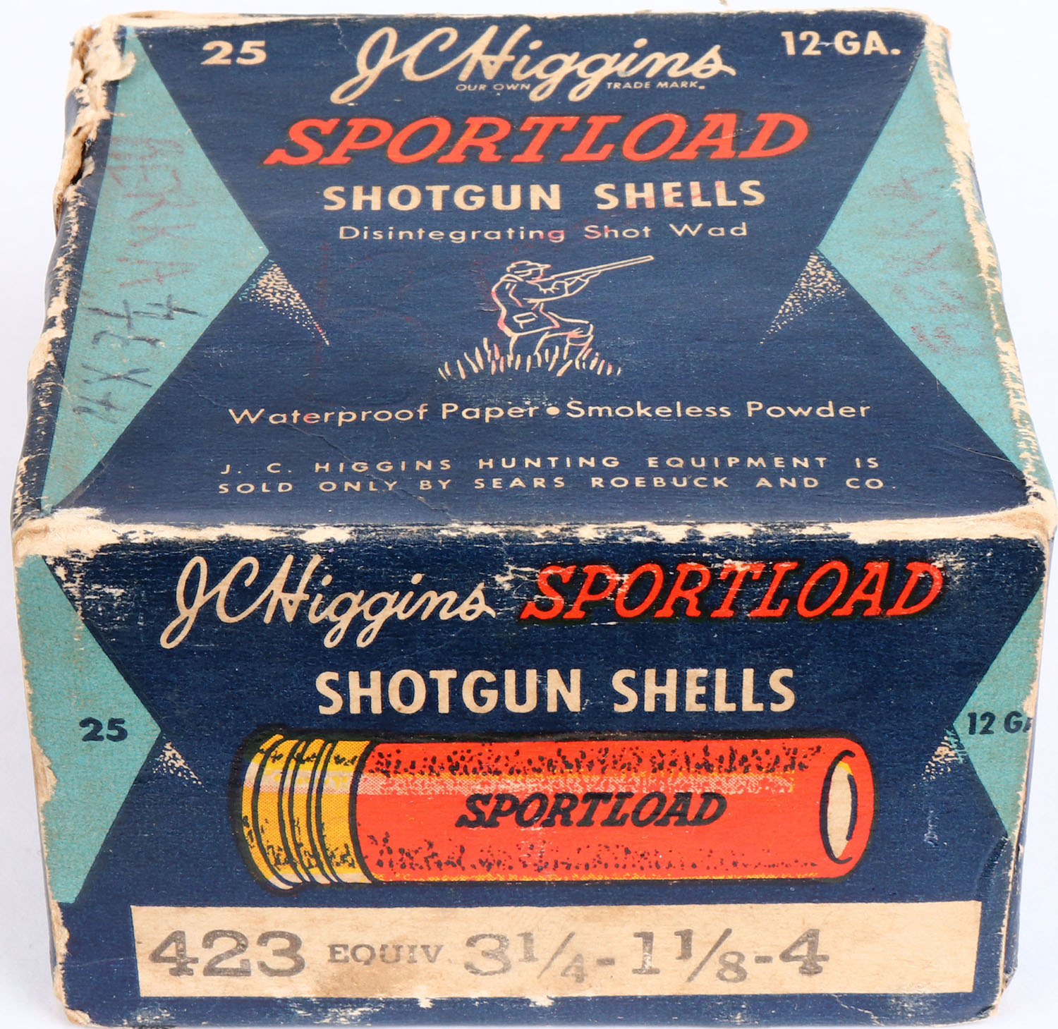 Sears, J.C. Higgins, Sportload, 12ga., 1pc., Full, shot size 4, multi-colored box, box has seam split, edge wear & writing on front of box with very good color, Shells are excellent. Grade: Very Good ++ - Value: 10 to 40