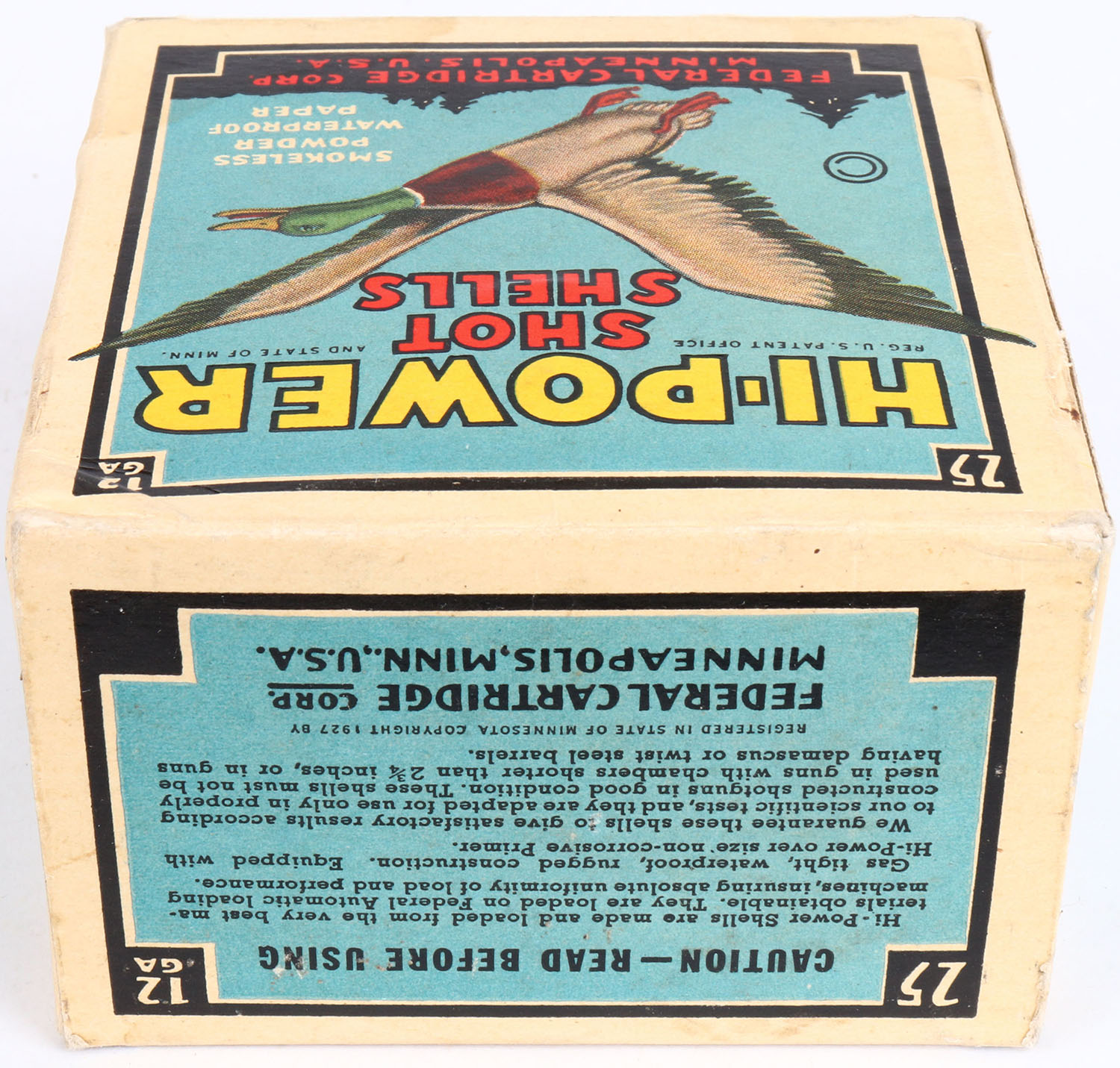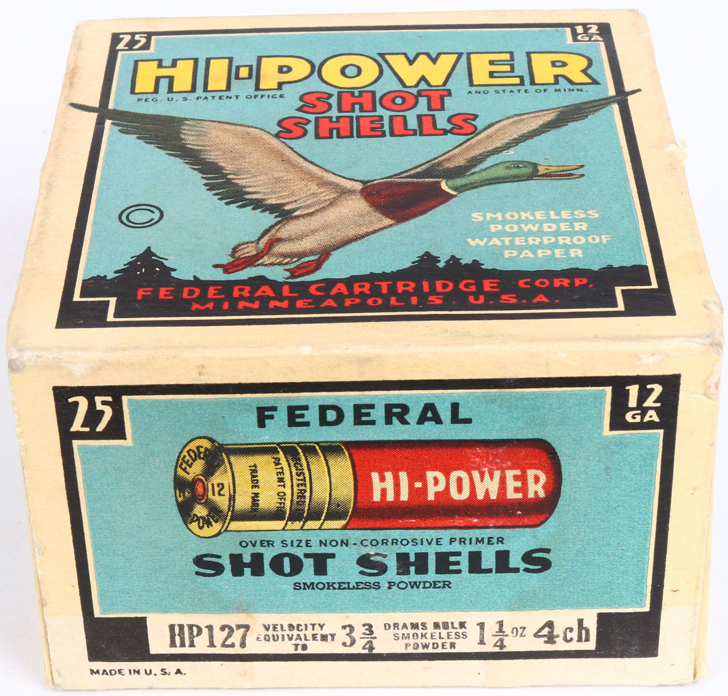 Federal Cart. Co., HI-POWER, 12ga., 1pc., Full, shot size 4ch, Black border, blue, yellow and red box with flying mallard, box is solid with great color & light soiling, shells are excellent. Grade: Excellent + - Value: 10 to 40