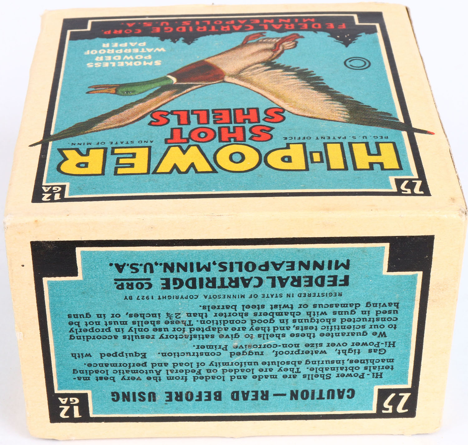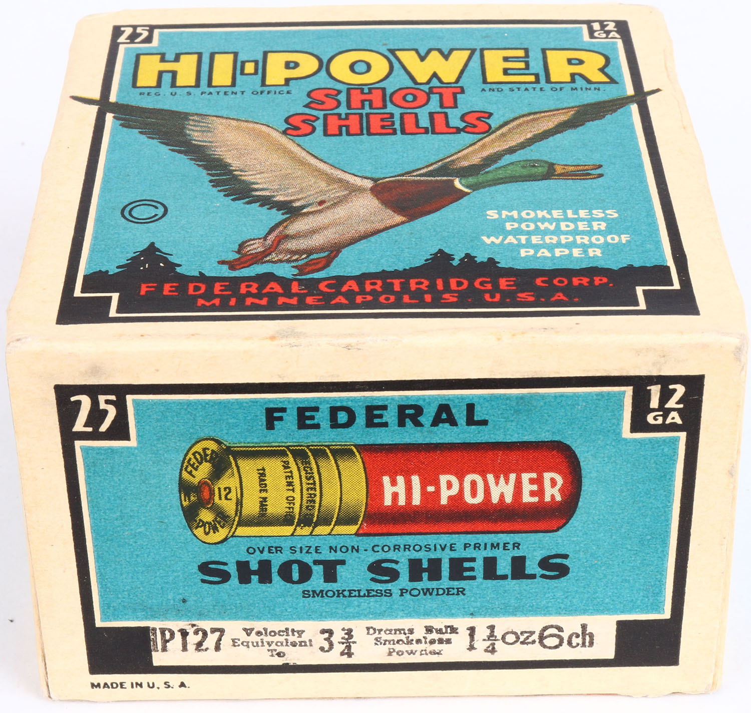 Federal Cart. Co., HI-POWER with insert, 12ga., 1pc., Full, shot size 6ch, Black border, blue, yellow and red box with flying mallard, box is very solid with great color, shells are excellent. Grade: Excellent ++ - Value: 10 to 40