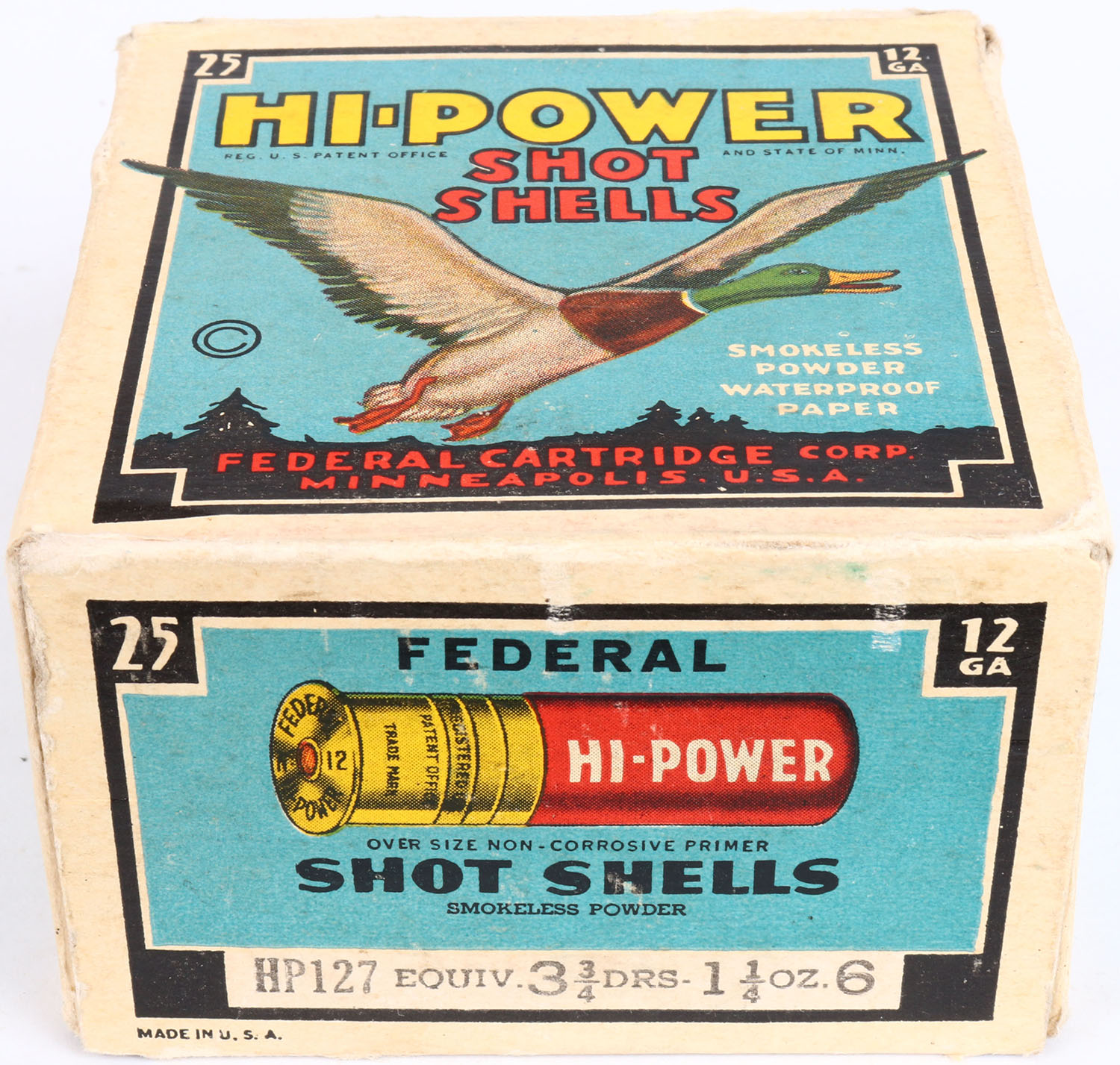 Federal Cart. Co., HI-POWER, 12ga., 1pc., Full, shot size 6, Black border, blue, yellow and red box with flying mallard, box is solid with great color, shells are excellent. Grade: Excellent + - Value: 10 to 40