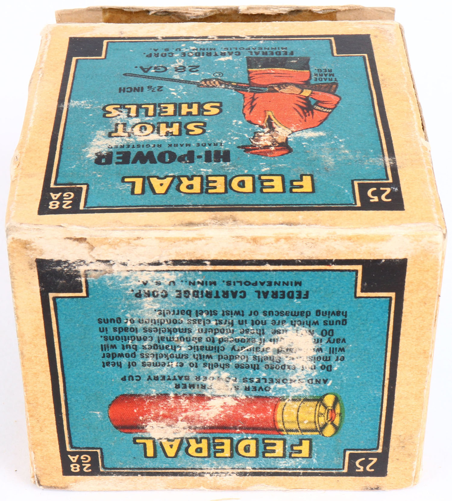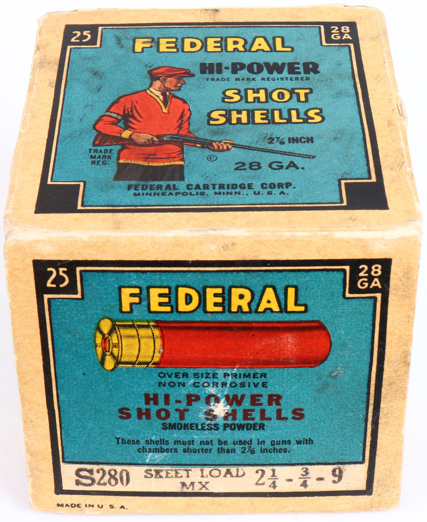 Federal Cart. Co., HI-POWER Skeet Load, 28ga., 1pc., Full, shot size 9, Black border, blue, yellow and red box with trap shooter, box has torn top flap, edge wear, small shell protrusions & scuffing with great color, shells are excellent. Grade: Excellent + - Value: 20 to 50