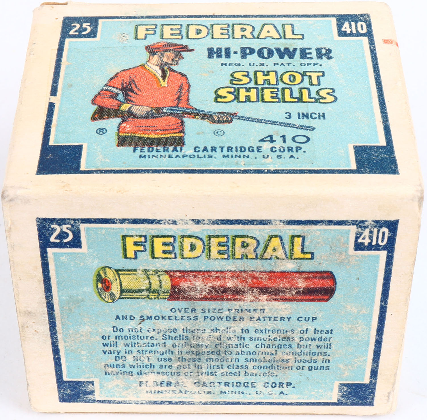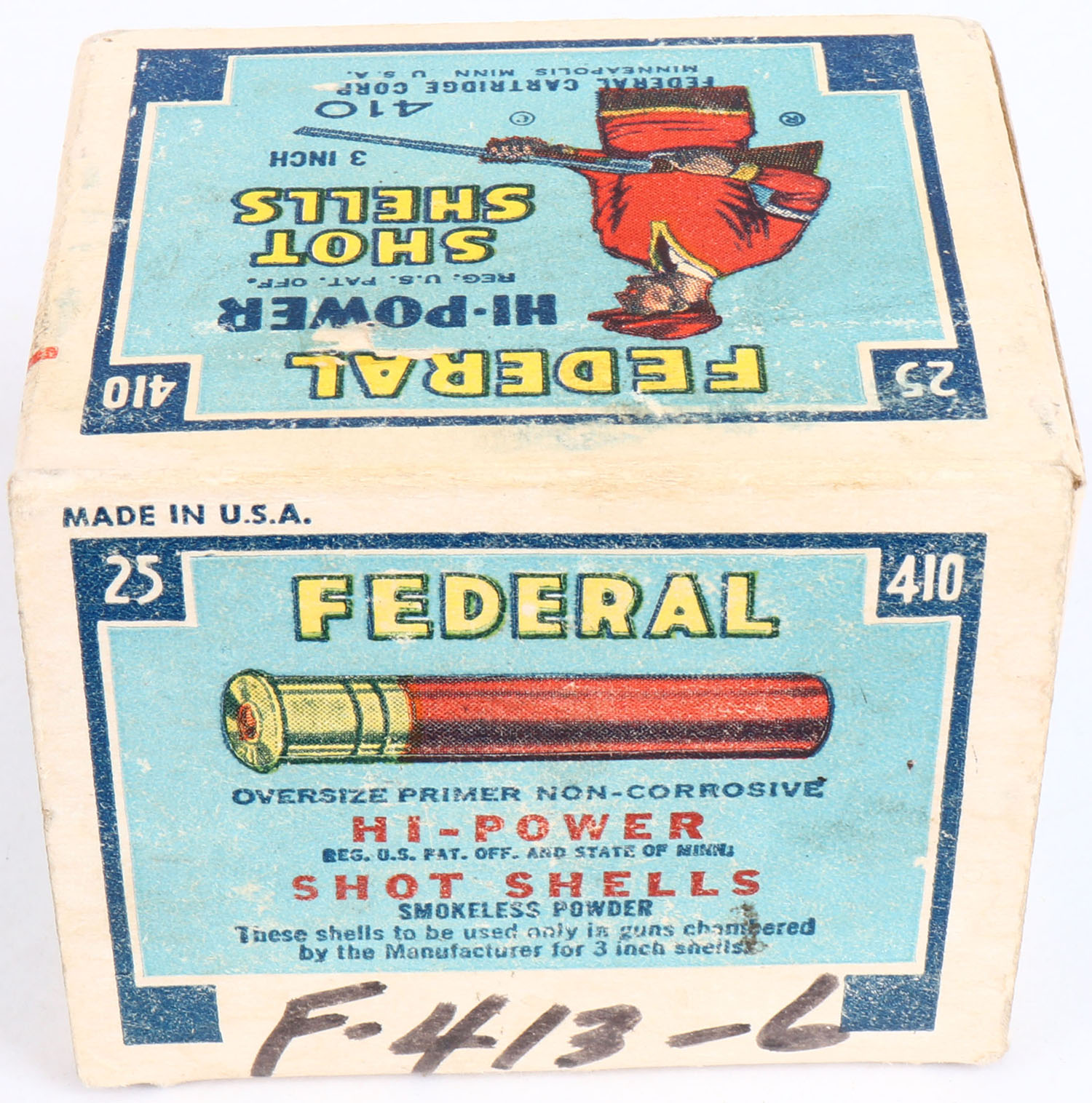Federal Cart. Co., HI-POWER, 410ga., 1pc., Full of new plastic shells, shot size 6, Blue border, blue, yellow and red box with Trap Shooter, box is solid with light soiling, light scuffing has very nice color, shells are excellent. Grade: Very Good ++ - Value: 20 to 50