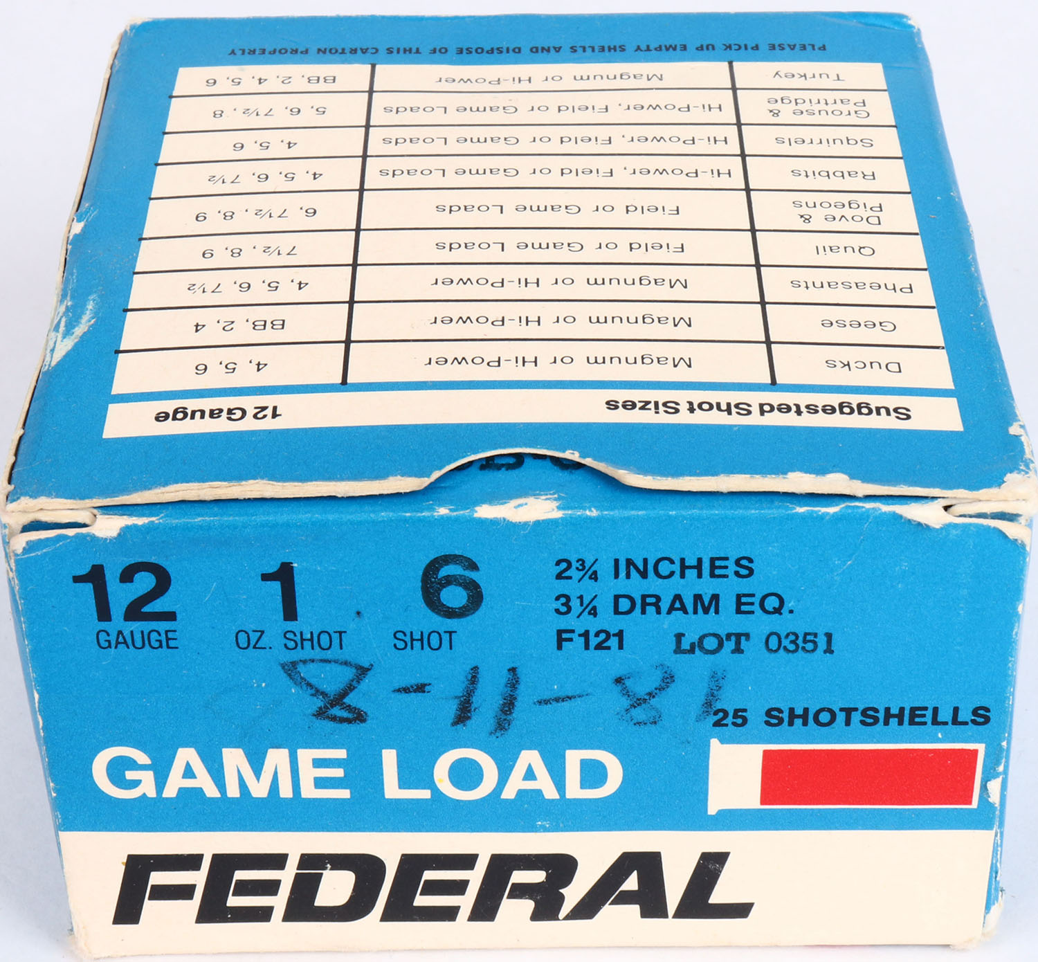 Federal, Game Load, 12ga., 1pc., Full, shot size 6, multi-colored box, shells are excellent. Grade: Excellent - Value: 10 to 20