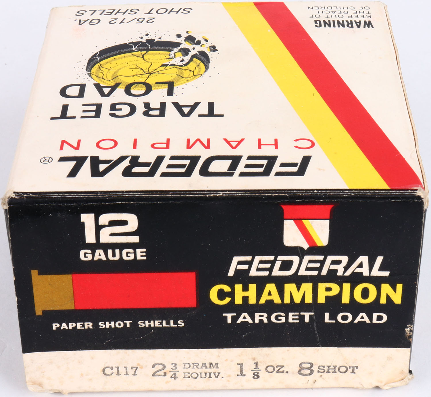 Federal, Champion Target Load, 12ga., 1pc., Full of mixed brand & size, shot size 8, multi-colored box, shells are excellent. Grade: Very Good ++ - Value: 4 to 20
