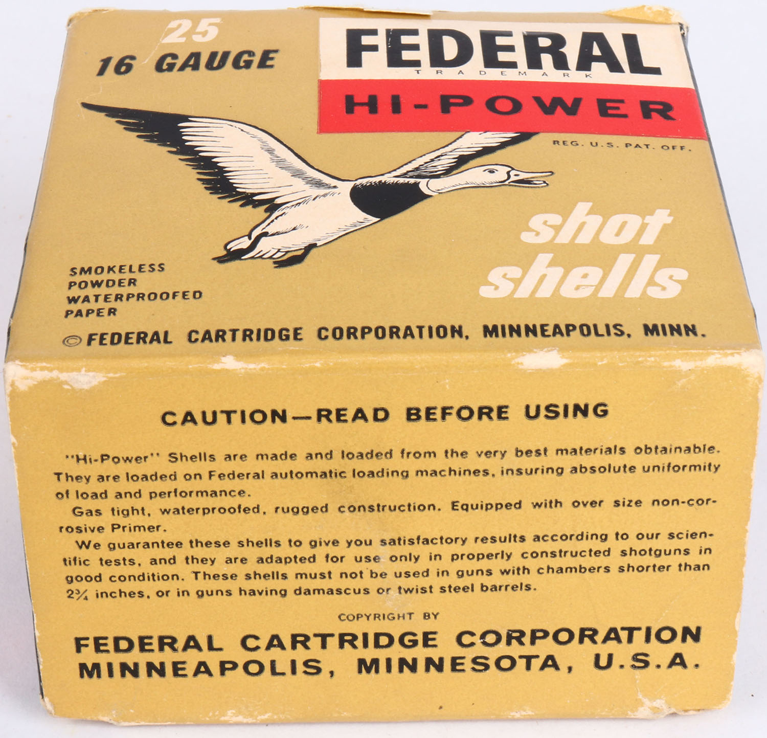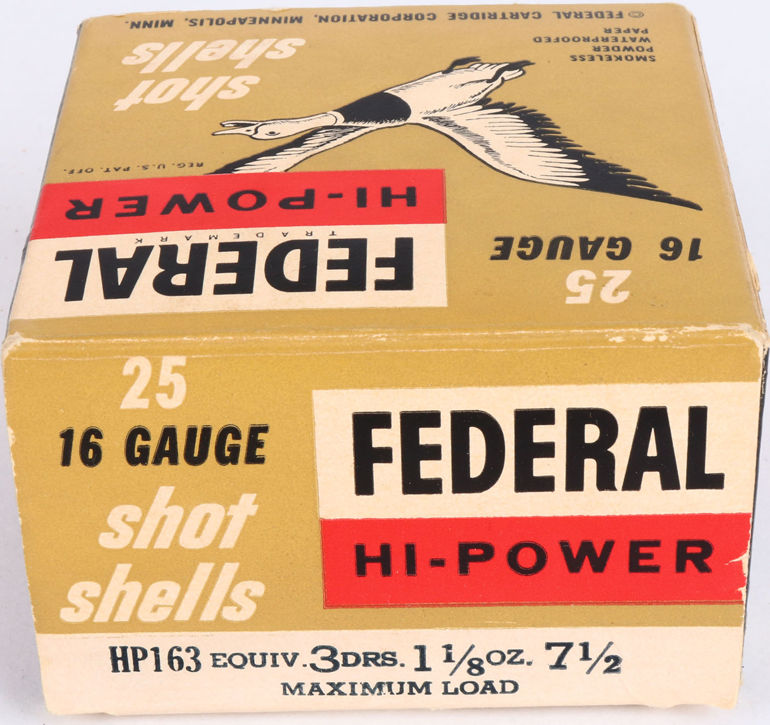Federal, Hi-Power, 16ga., 1pc., Partial 21rds, shot size 7 1/2, multi-colored box, shells are excellent. Grade: Excellent - Value: 10 to 20