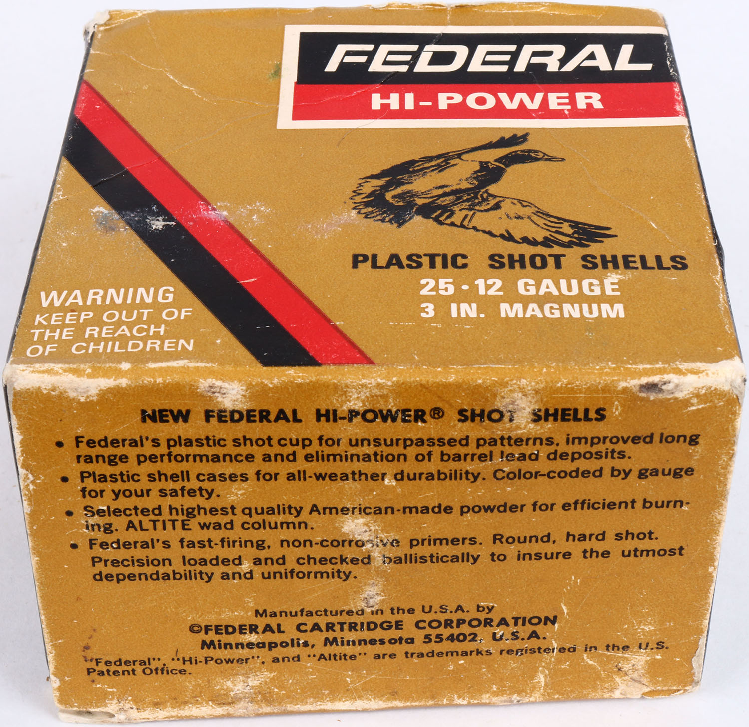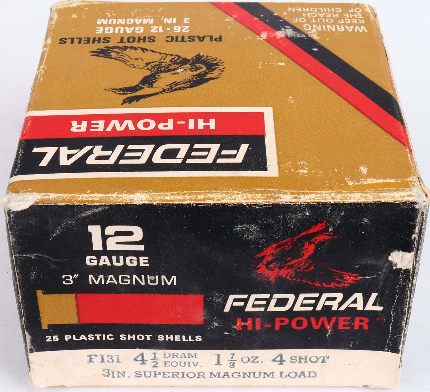 Federal, Hi-Power, 12ga., 1pc., Full, shot size 4, multi-colored box, shells are very good. Grade: Very Good ++ - Value: 10 to 20