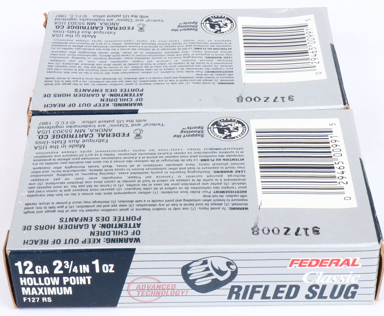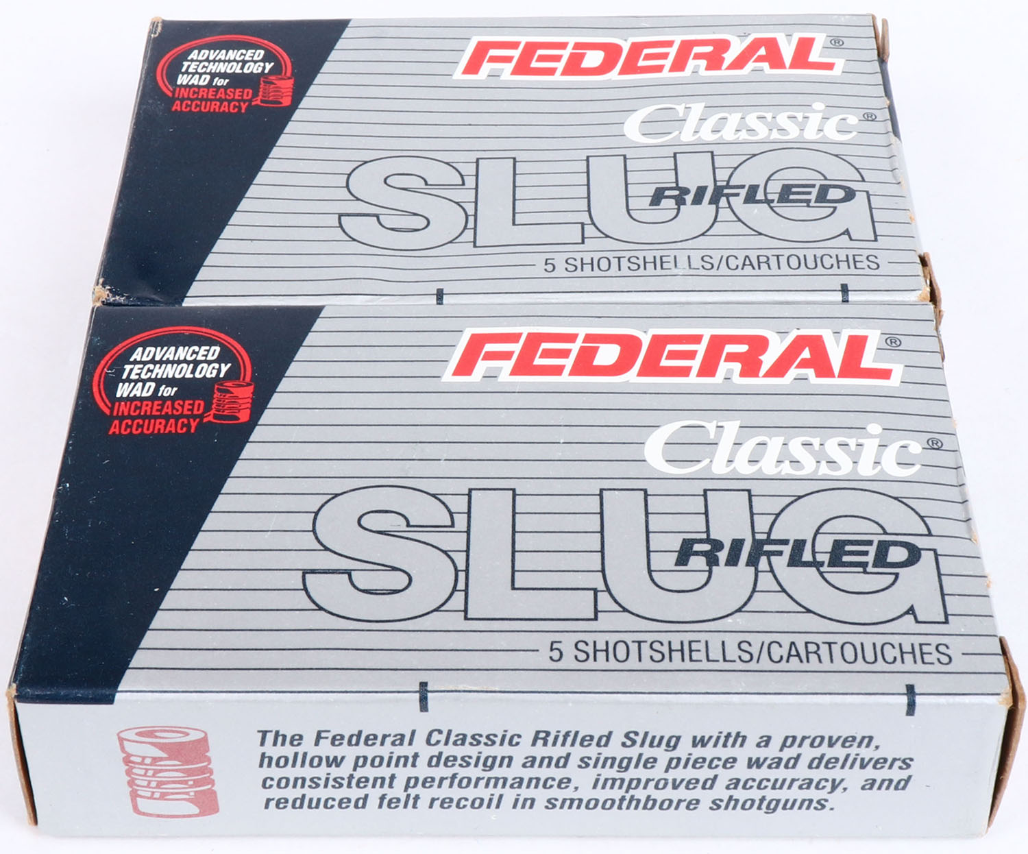 Federal, 12ga., 1pc., Full, shot size Rifled Hollow Point Slugs, multi-colored box, shells are excellent. Grade: Excellent - Value: 4 to 20