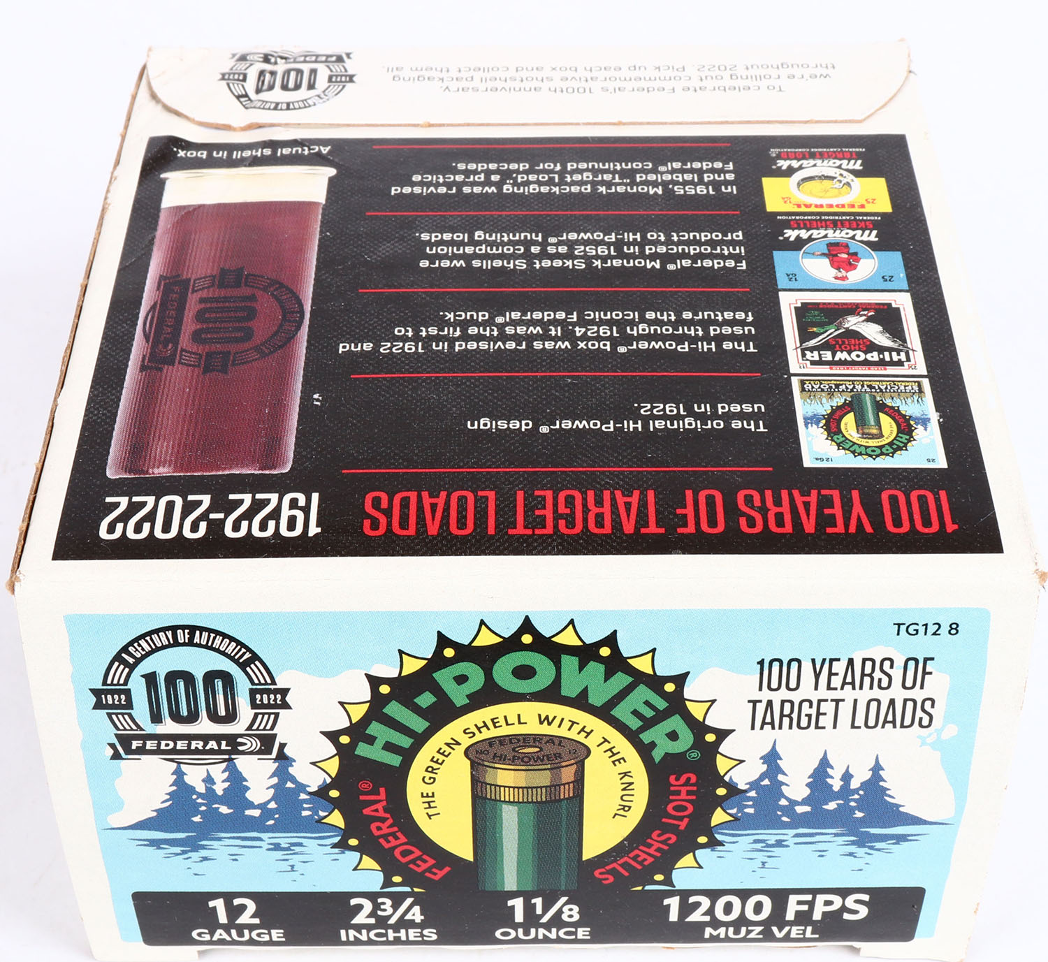 Federal Cart. Co., Hi-Power 100 Year Anniversary, 12ga., 1pc., Full, shot size 8 Special Trap Load, multi-colored box with green shell in front of marsh, box very solid with Minty color box shows earlier boxes and when they were introduced also tells little story about Federal, shells are Minty. Grade: Excellent ++ - Value: 20 to 60