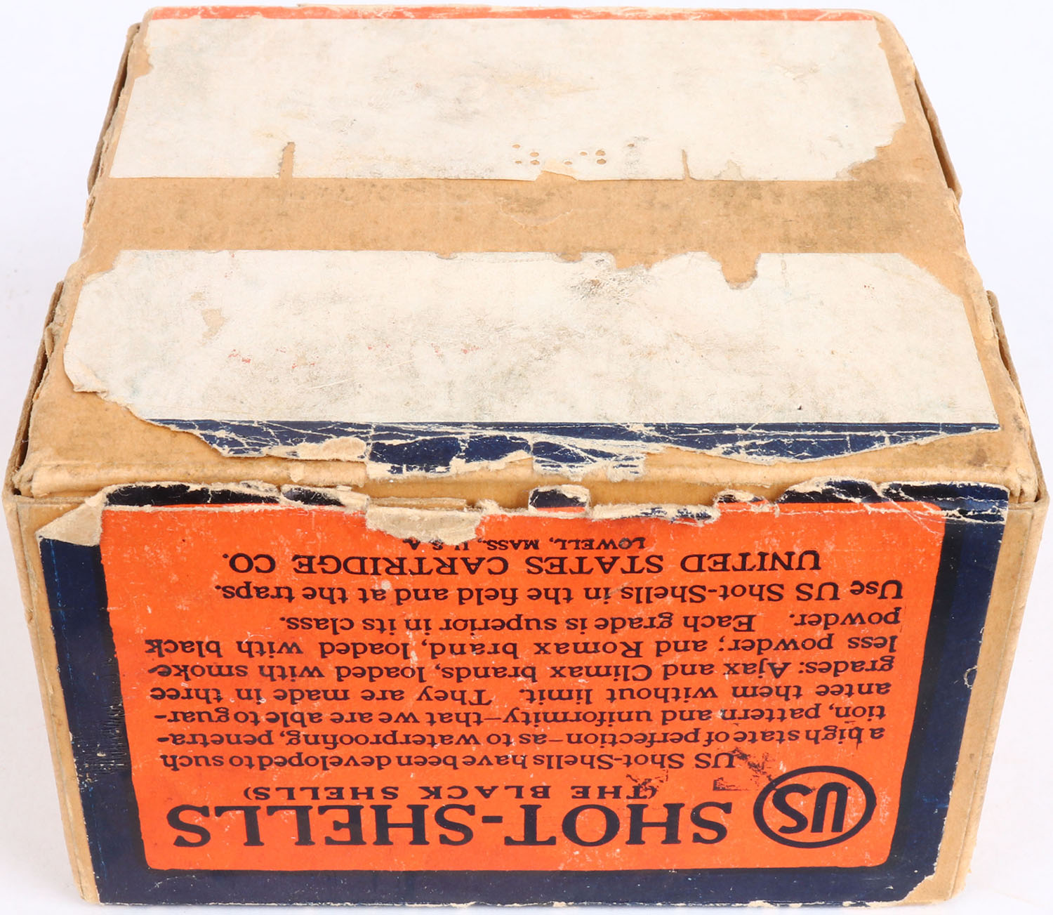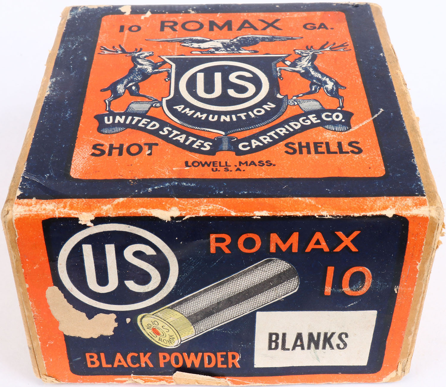 US Cart. Co., Lowell, Mass, Romax, 10ga, 2pc., Full, Black Powder Blanks, buff box orange, blue & white label, box has shell protrusions, scuffing, with great colors, Shells are very good. Grade: Excellent - Value: 30 to 100