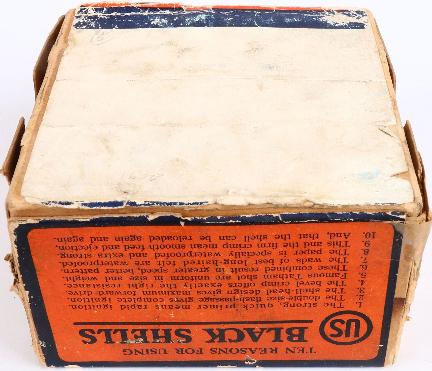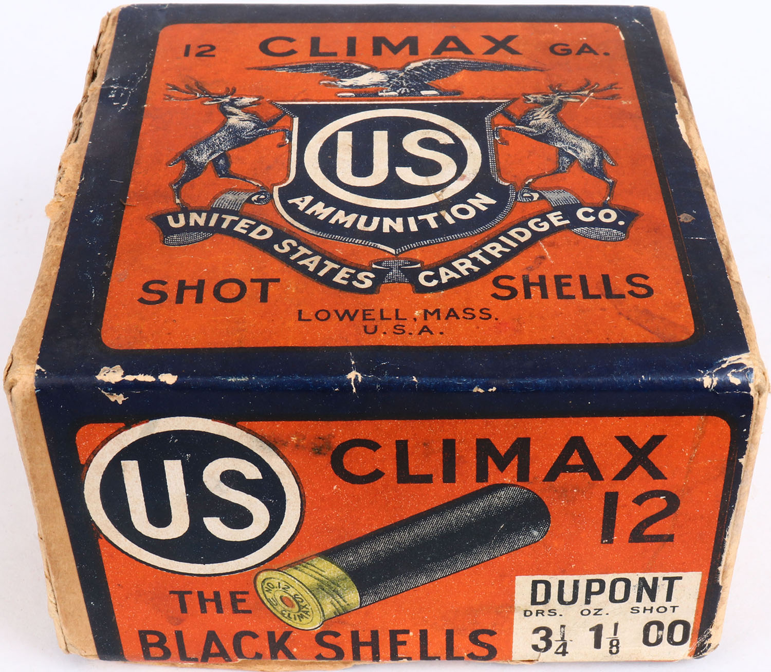 US Cart. Co., Lowell, Mass, Climax, 12ga, 2pc., Partial 11rds, shot size 00 Buck, buff box orange, blue & white label, box has seam split, tape repairs, & soiling with very nice colors, Shells are very good. Grade: Very Good ++ - Value: 20 to 80
