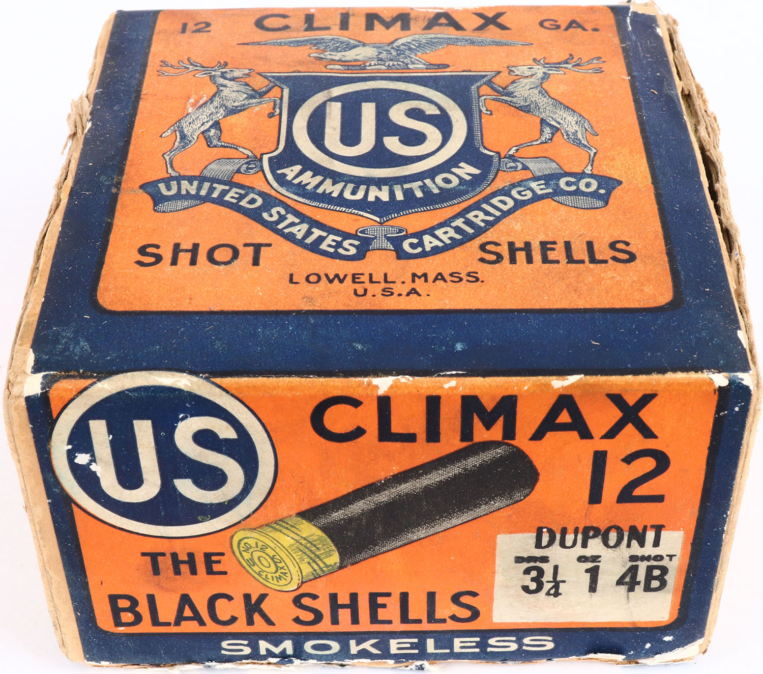 US Cart. Co., Lowell, Mass, Climax, 12ga, 2pc., Partial 23rds, shot size 4B, buff box orange, blue & white label, box has seam splits & soiling with very nice colors, Shells are very good. Grade: Very Good ++ - Value: 10 to 80