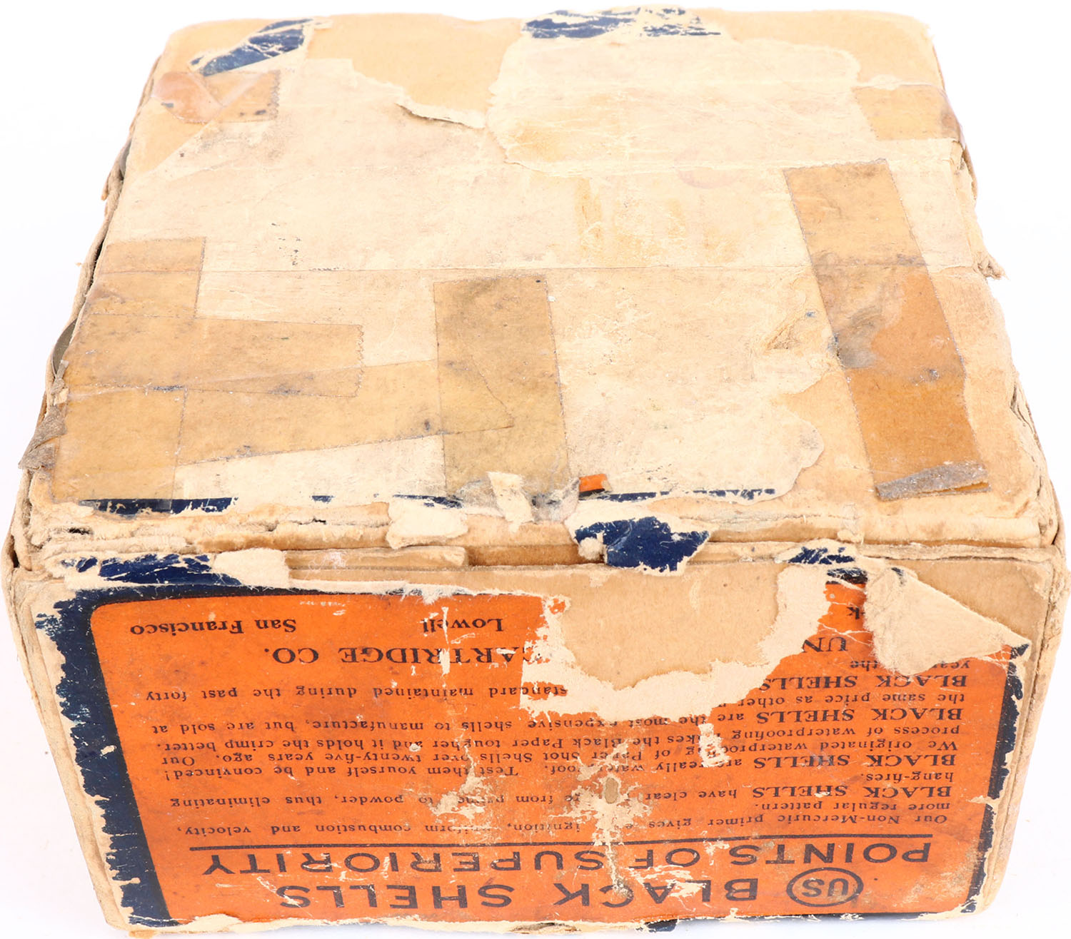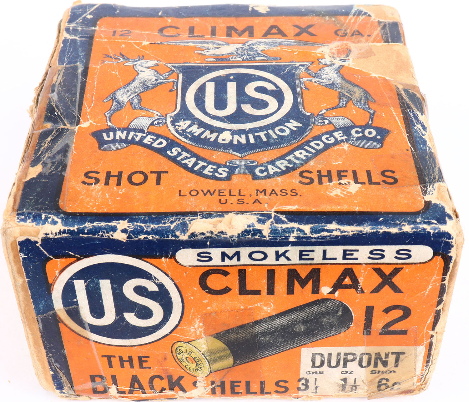 US Cart. Co., Lowell, Mass, Climax, 12ga, 2pc., Full, shot size 6C, buff box orange, blue & white label, box has seam splits, tape repair, scuffing & soiling with nice colors, Shells are excellent. Grade: Very Good + - Value: 10 to 60