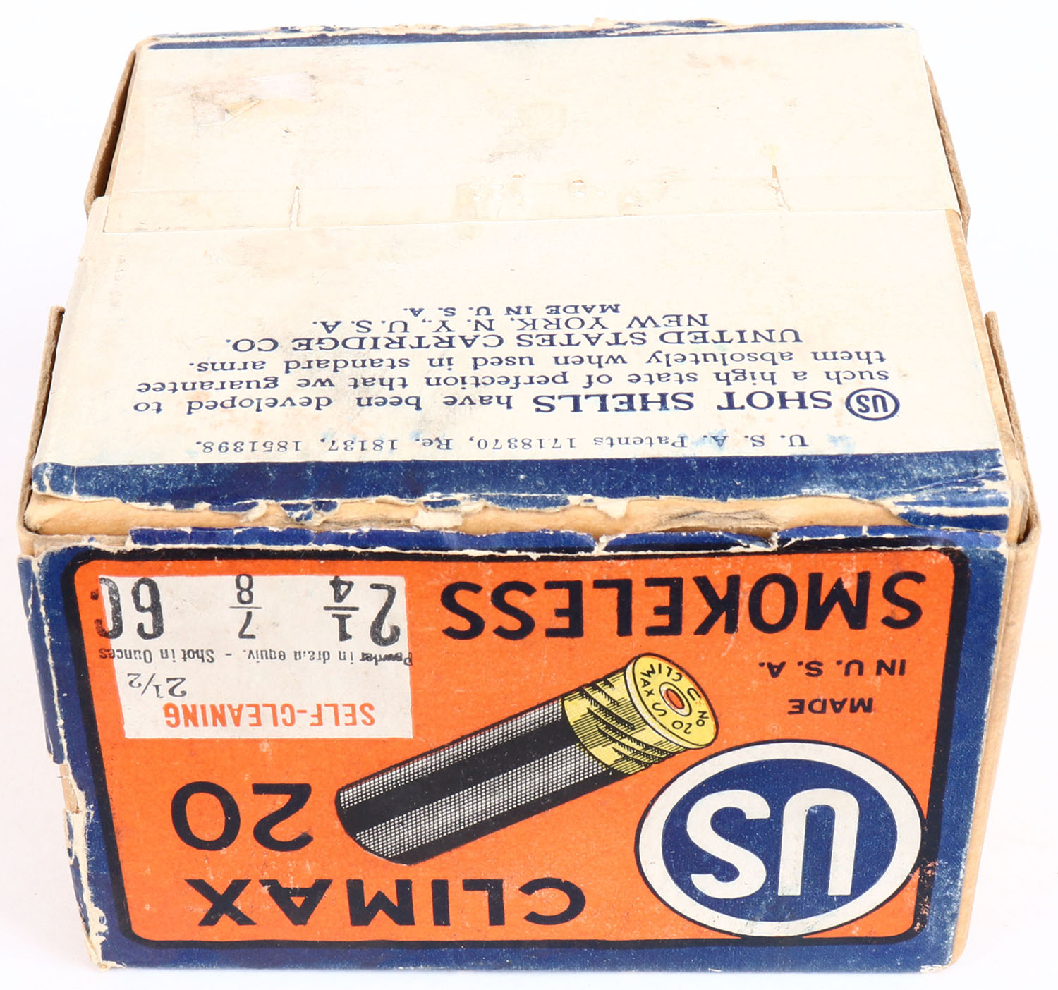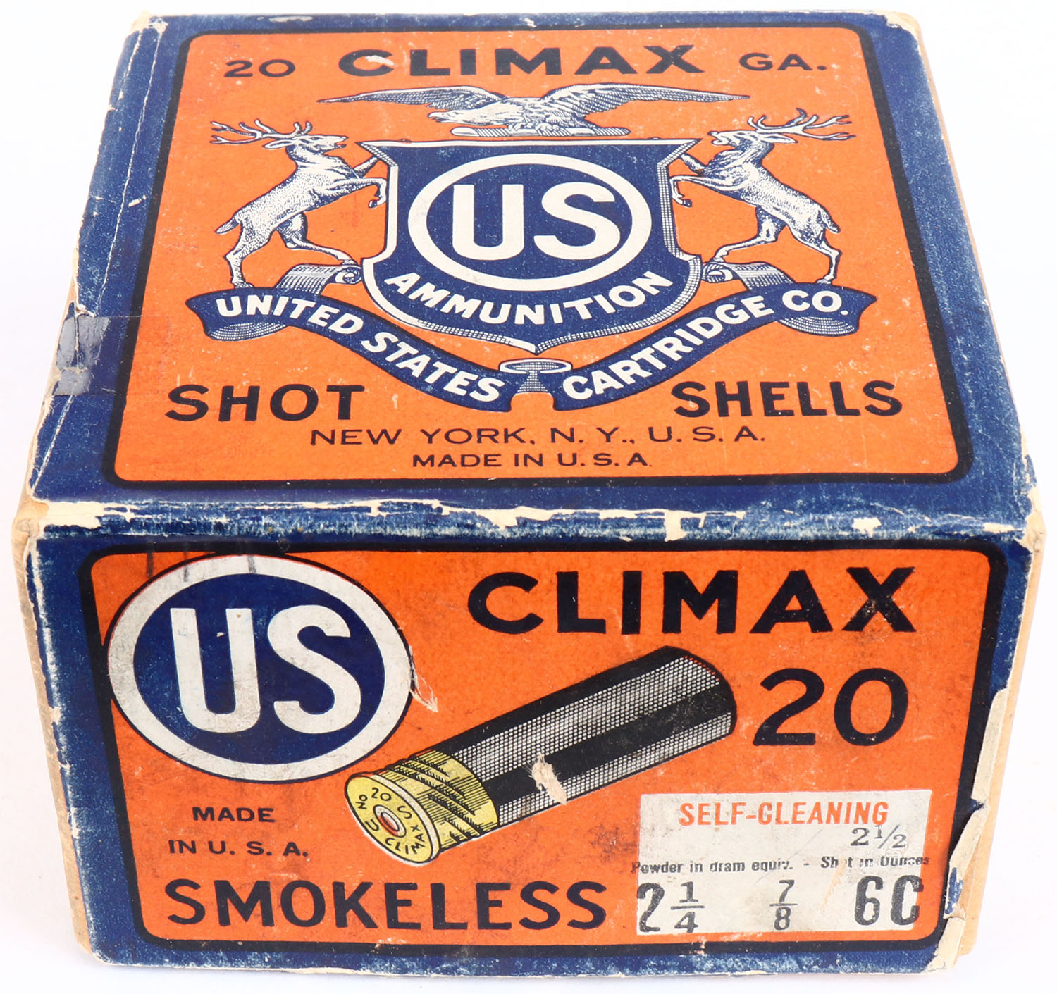 US Cart. Co., Lowell, Mass, Climax, 20ga, 2pc., Empty, shot size 6C, buff box orange, blue & white label, box has tape repair & light soiling with great colors. Grade: Excellent - Value: 10 to 60