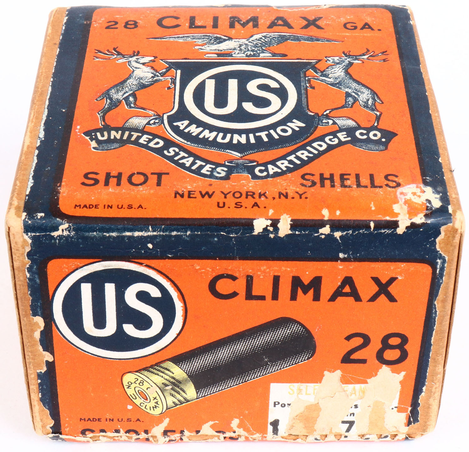 US Cart. Co., Lowell, Mass, Climax, 28ga, 2pc., Full, shot size 7 1/2C, buff box orange, blue & white label, box has scuffing & light edge wear with great colors. Grade: Excellent - Value: 30 to 100