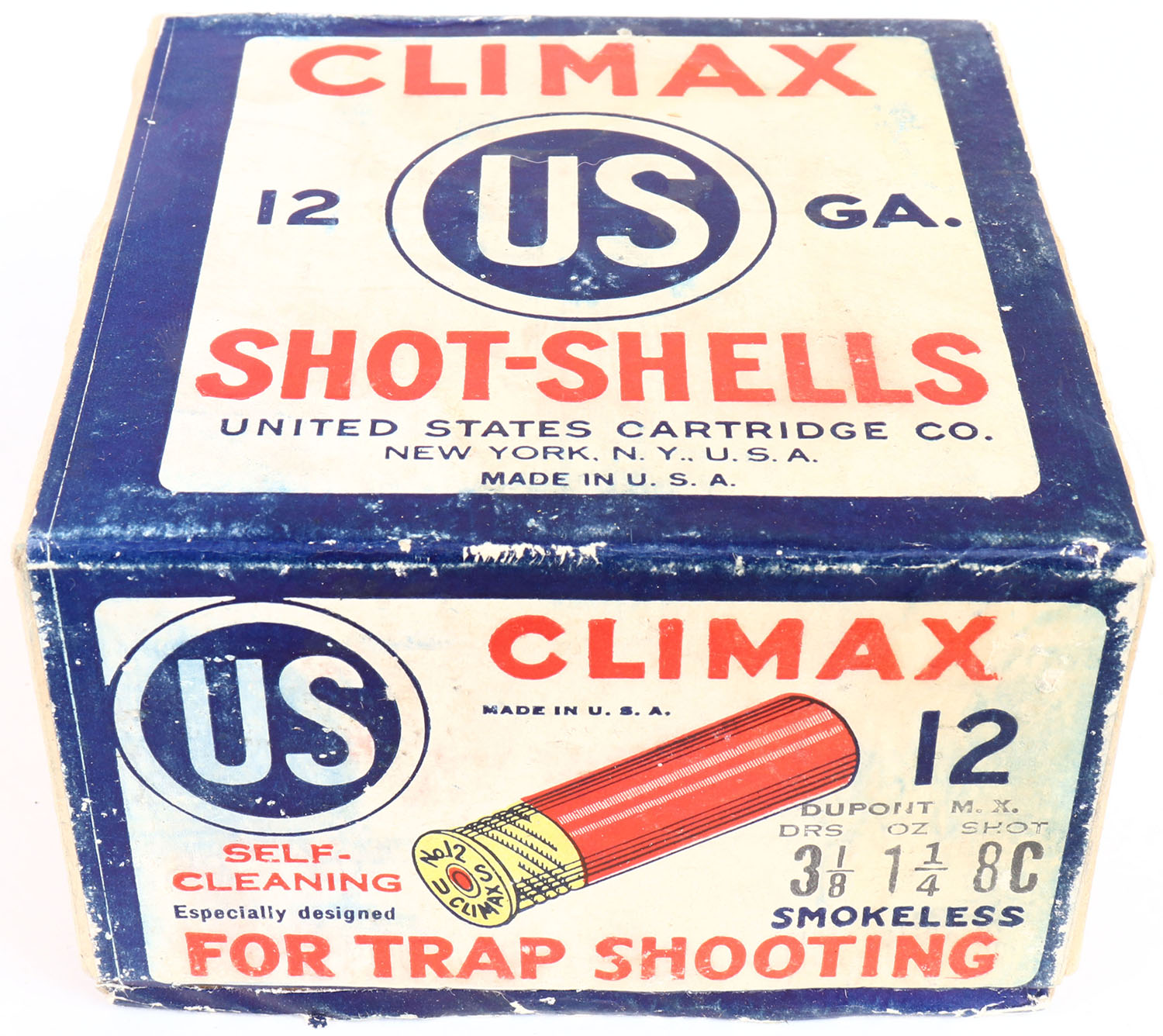 U.S. Cart. Co., New York, NY, CLIMAX, FOR TRAP SHOOTING, 12ga., 2pc., Full, shot size 8C, buff box with white, red & blue paper label, box has soiling, is solid with great label, Shells are excellent. Grade: Excellent + - Value: 100 to 300