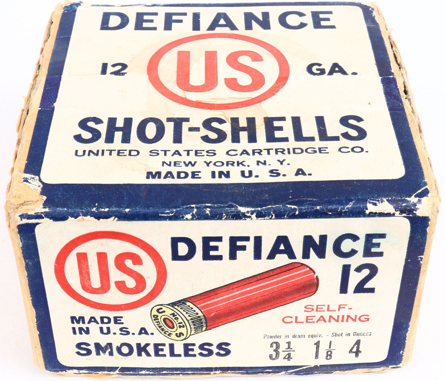 United States Cart. Co., New York, NY, DEFIANCE, 12ga., 2pc., Partial 19rds, shot size 4, buff box with white, red & blue label, box has seam splits, shell protrusion, scuffing & light soiling with very nice label, shells are excellent. Grade: Excellent - Value: 20 to 120