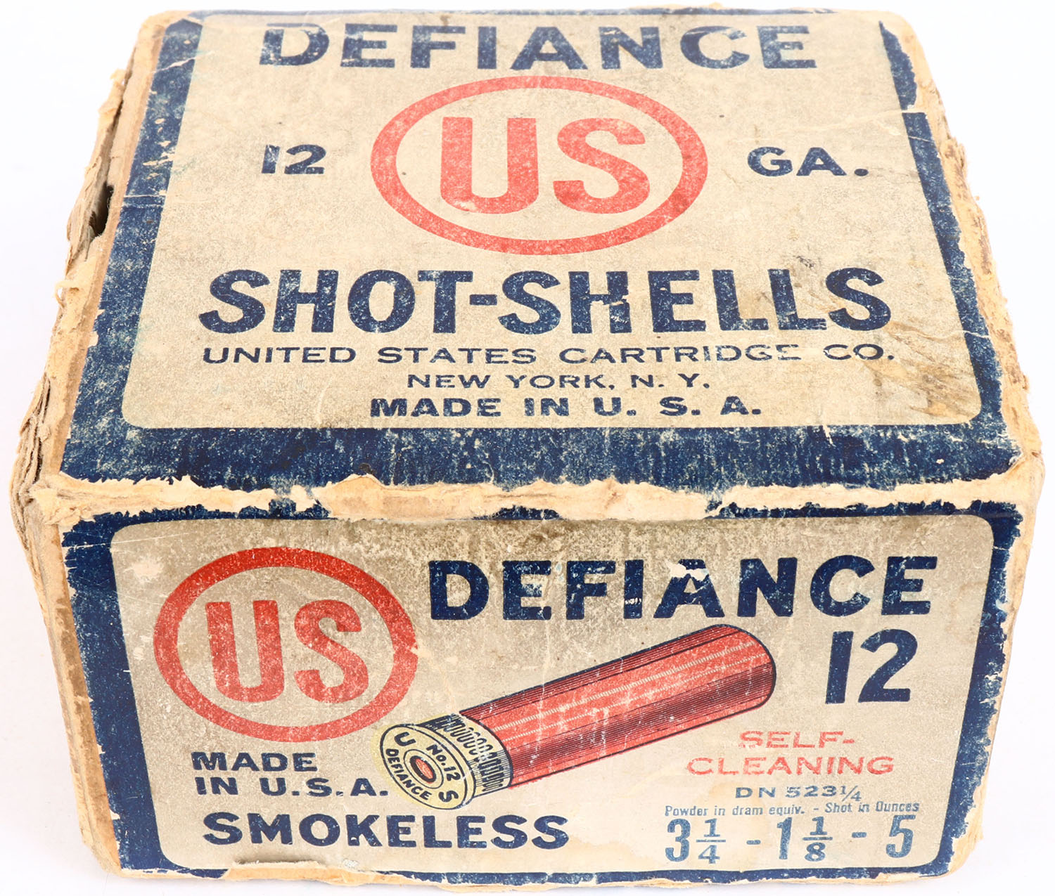 United States Cart. Co., New York, NY, DEFIANCE, 12ga., 2pc., Partial 5rds, shot size 5, buff box with white, red & blue label, box has seam splits, edge wear & age soiling with nice label, shells are excellent. Grade: Very Good ++ - Value: 20 to 100