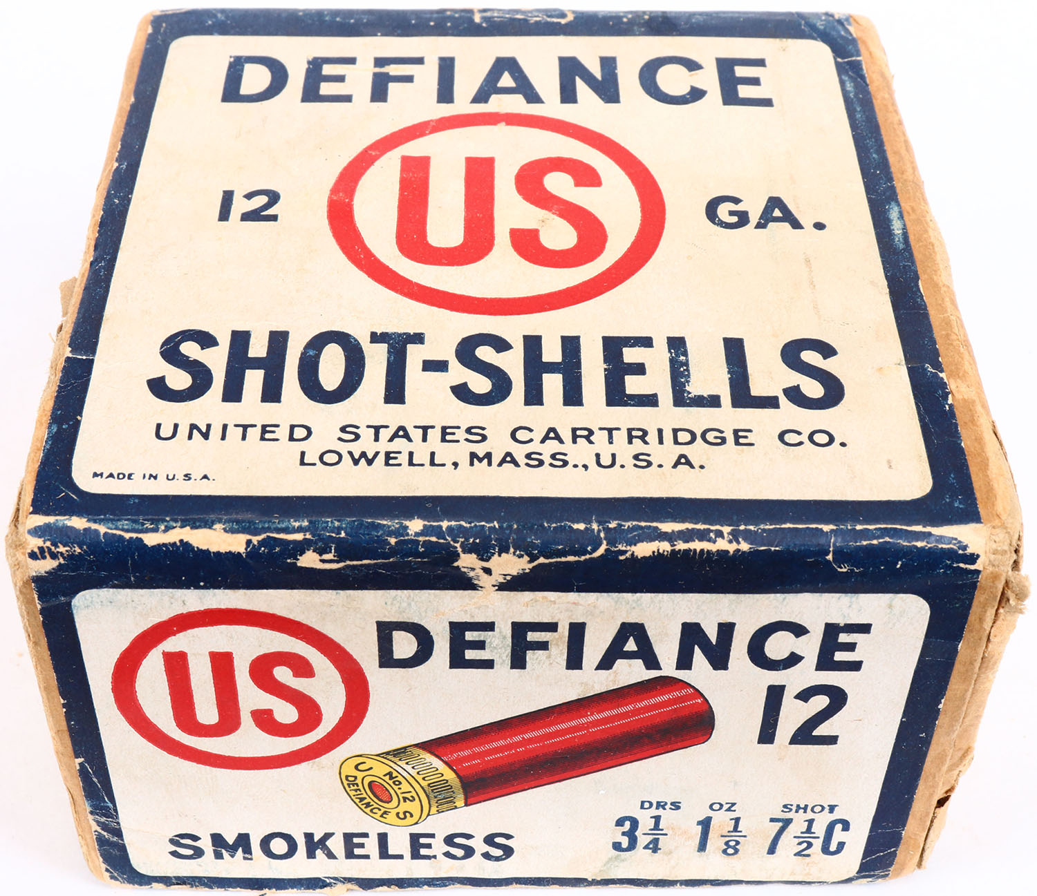 United States Cart. Co., Lowell, Mass, DEFIANCE, 12ga., 2pc., Empty, shot size 7 1/2C, buff box with white, red & blue label, box has seam split, light edge wear & scuffing with very nice label. Grade: Excellent - Value: 40 to 100