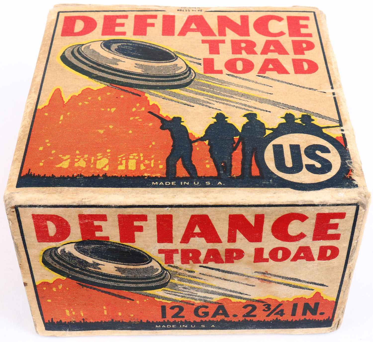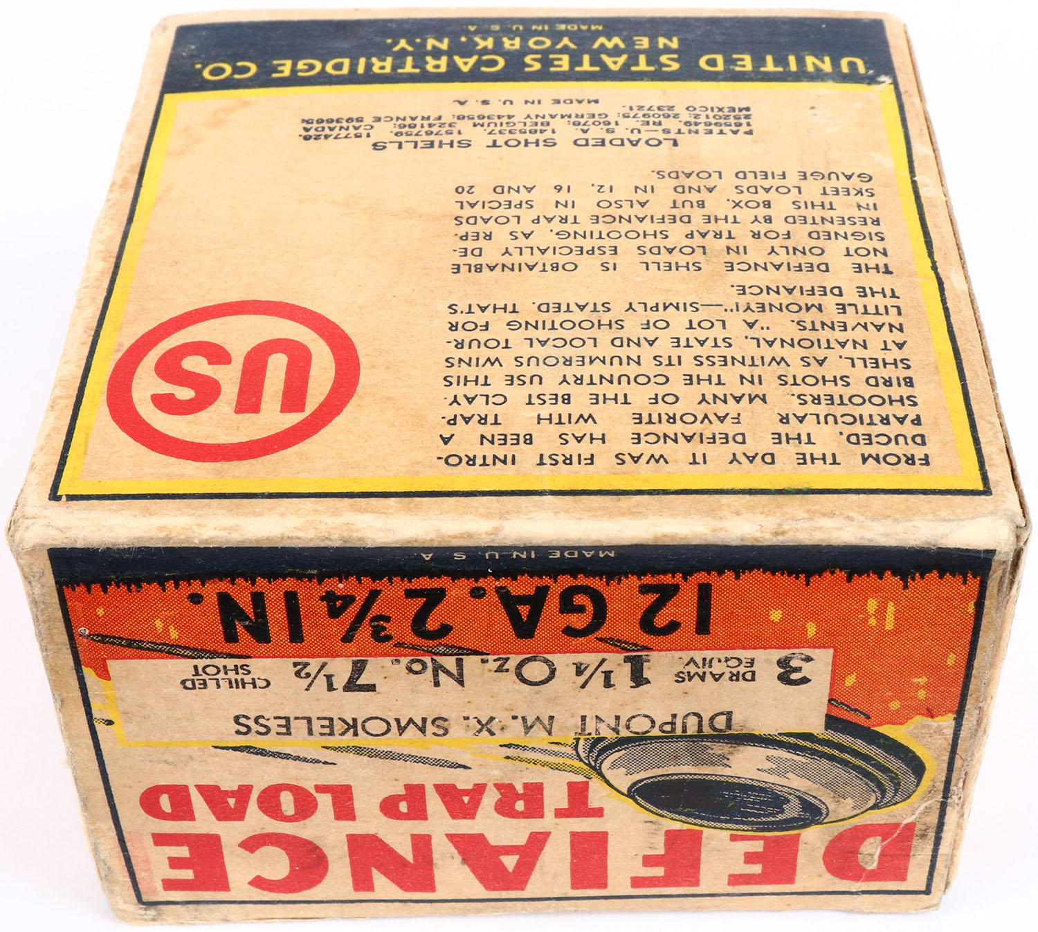 US Cart. Co., Defiance TRAP LOAD, 12ga., 1pc., Empty, shot size 7 1/2 Chilled Shot, 2 3/4''., white, blue, black, orange and yellow box, great graphics showing a Trap shooting scene, box has great colors.* Grade: Excellent + - Value: 400 to 1500