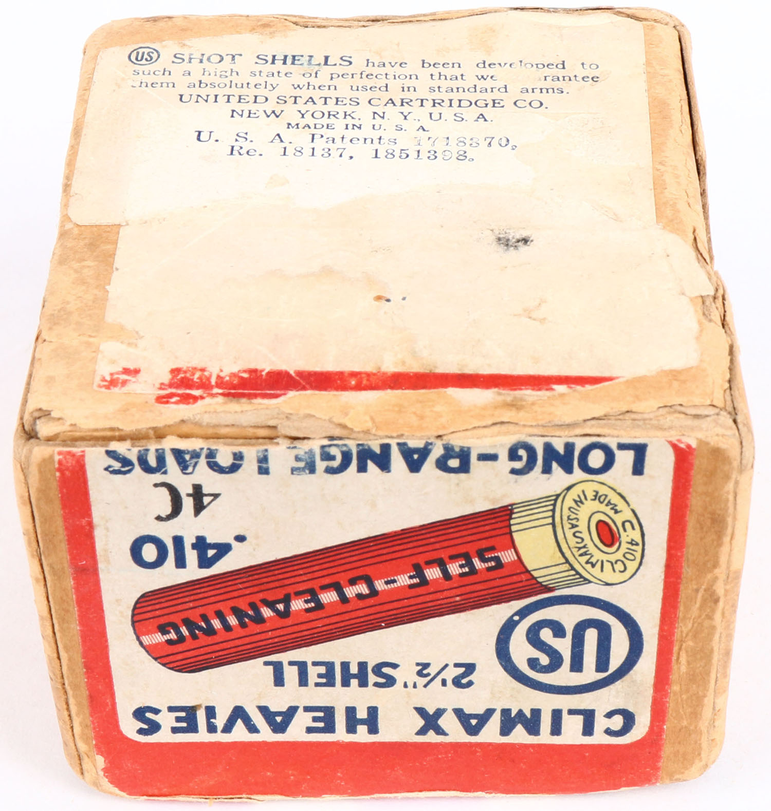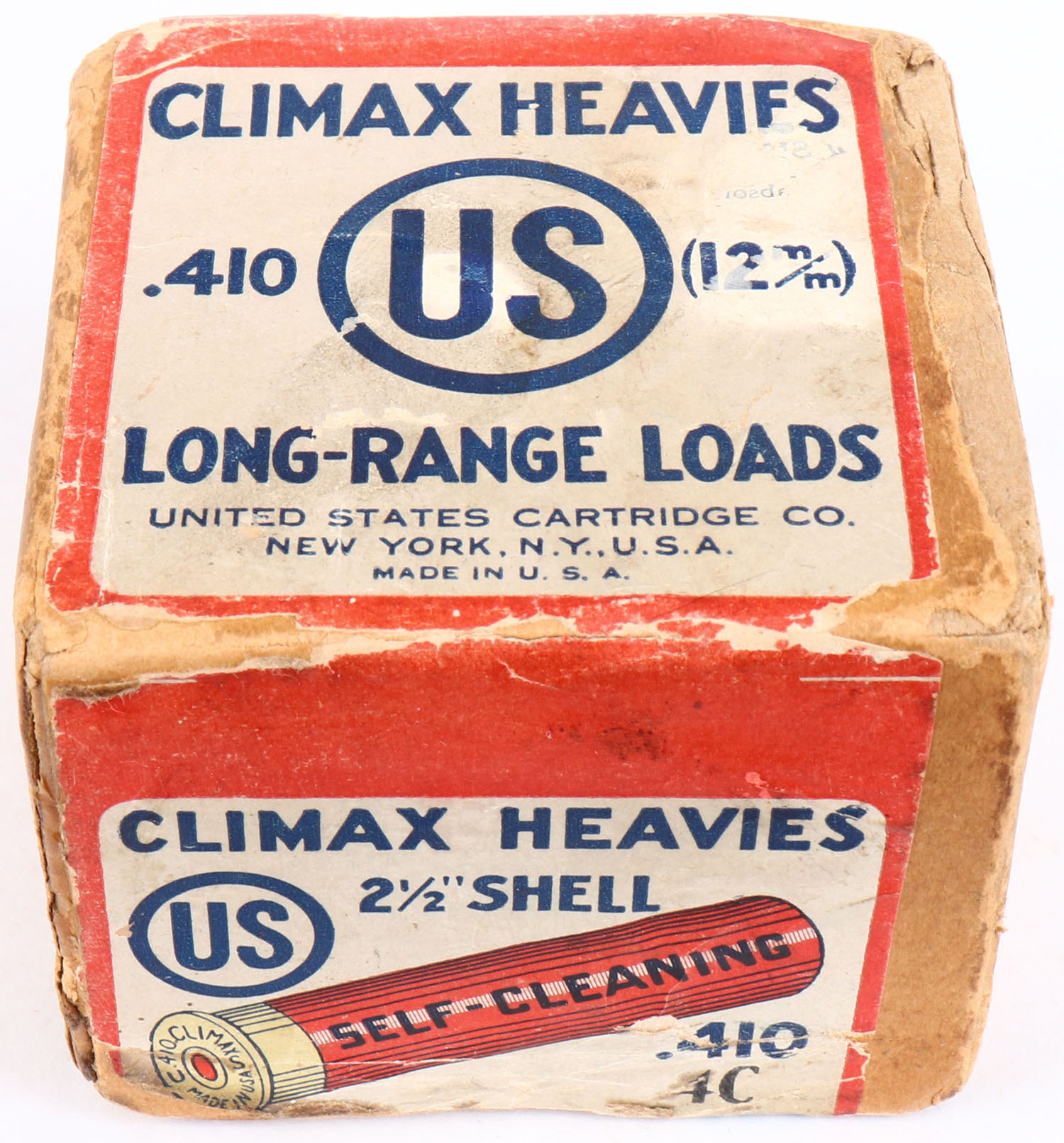 U.S. Cart. Co., New York, NY, CLIMAX HEAVIES, 410ga., 2pc., Empty, shot size 4C, buff box with white, orange & blue paper label, box has seam splits with bottom about disconnected, edge wear & label is very nice with light soiling. Grade: Very Good ++ - Value: 20 to 80