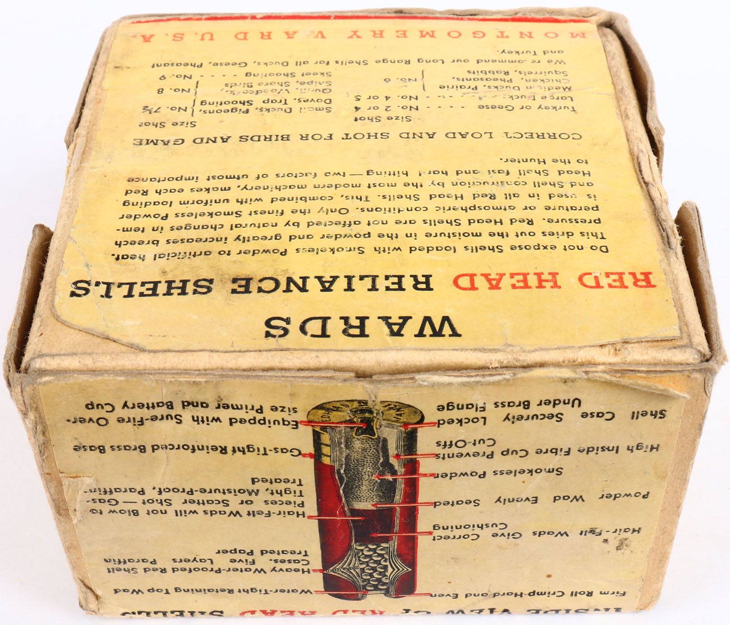 Montgomery Ward & Co., Red Head, 12ga., 2pc., Empty, shot size 6CH, red background with black goose flying through the moon, box is solid with great colors, light edge wear, light soiling. Grade: Very Good ++ - Value: 10 to 80