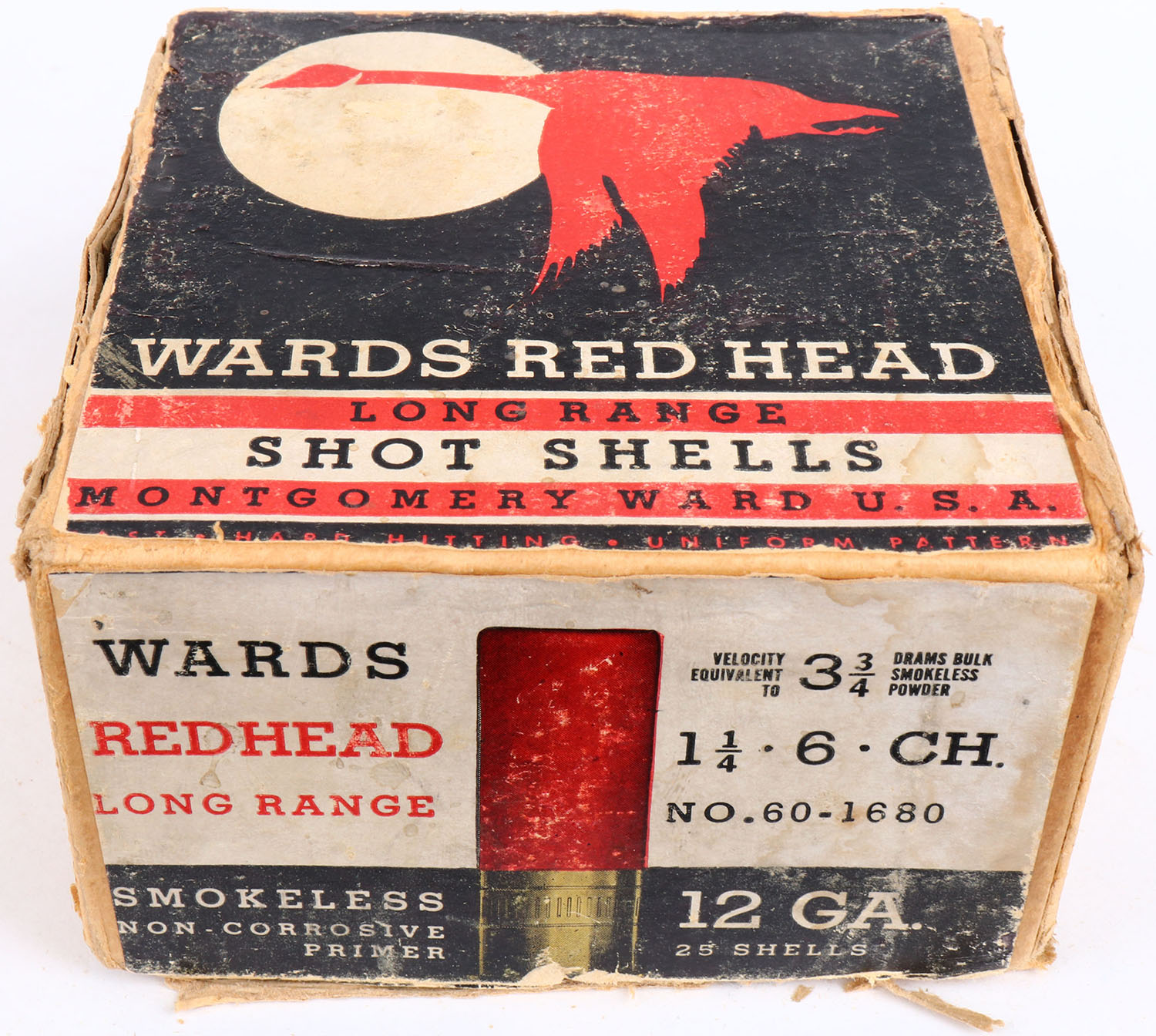 Montgomery Ward & Co., Red Head, 12ga., 2pc., Full, shot size 6CH, black background with red goose flying through the moon, box has seam splits & age soiling with very nice colors, Shells are excellent. Grade: Very Good ++ - Value: 20 to 100