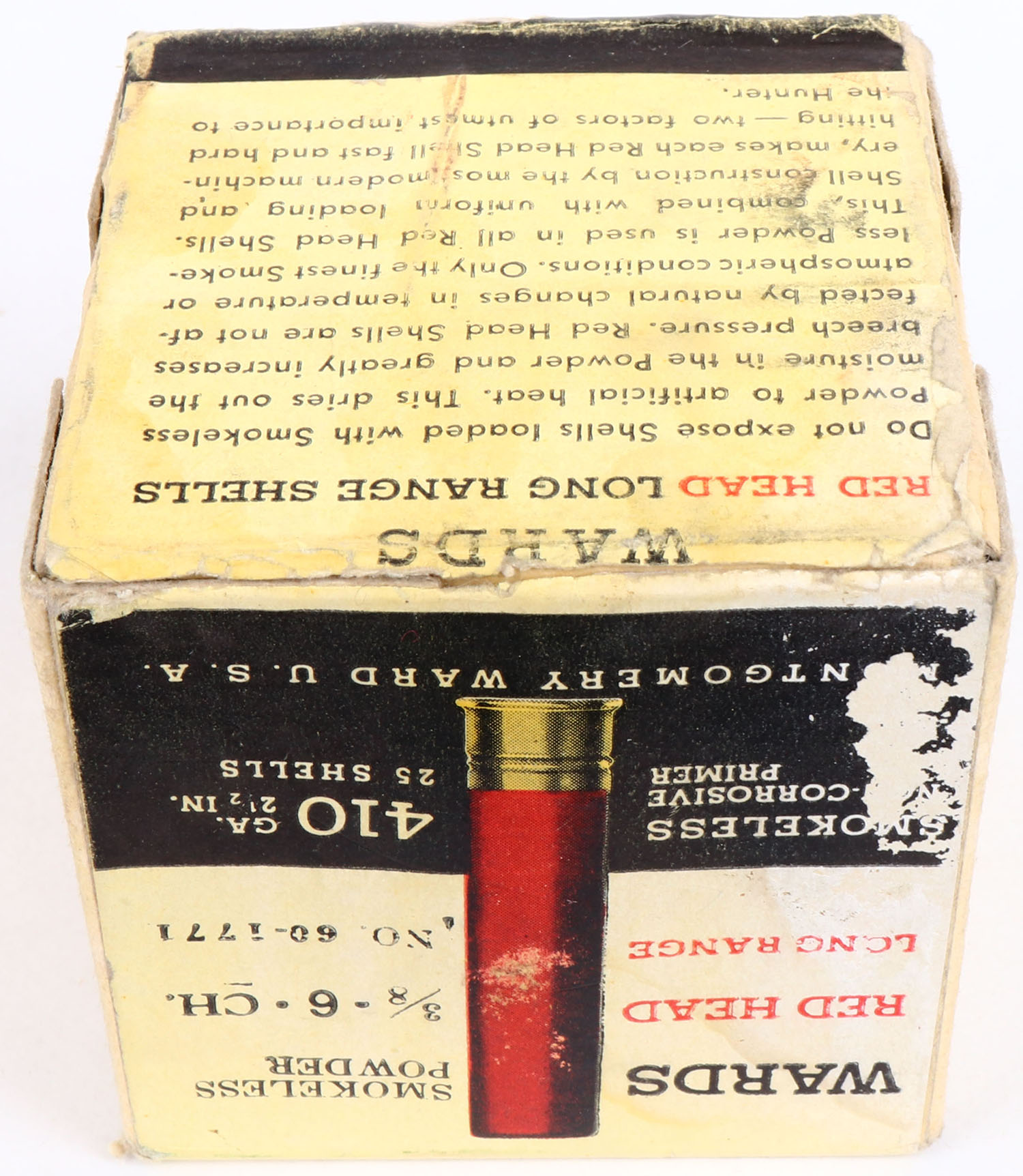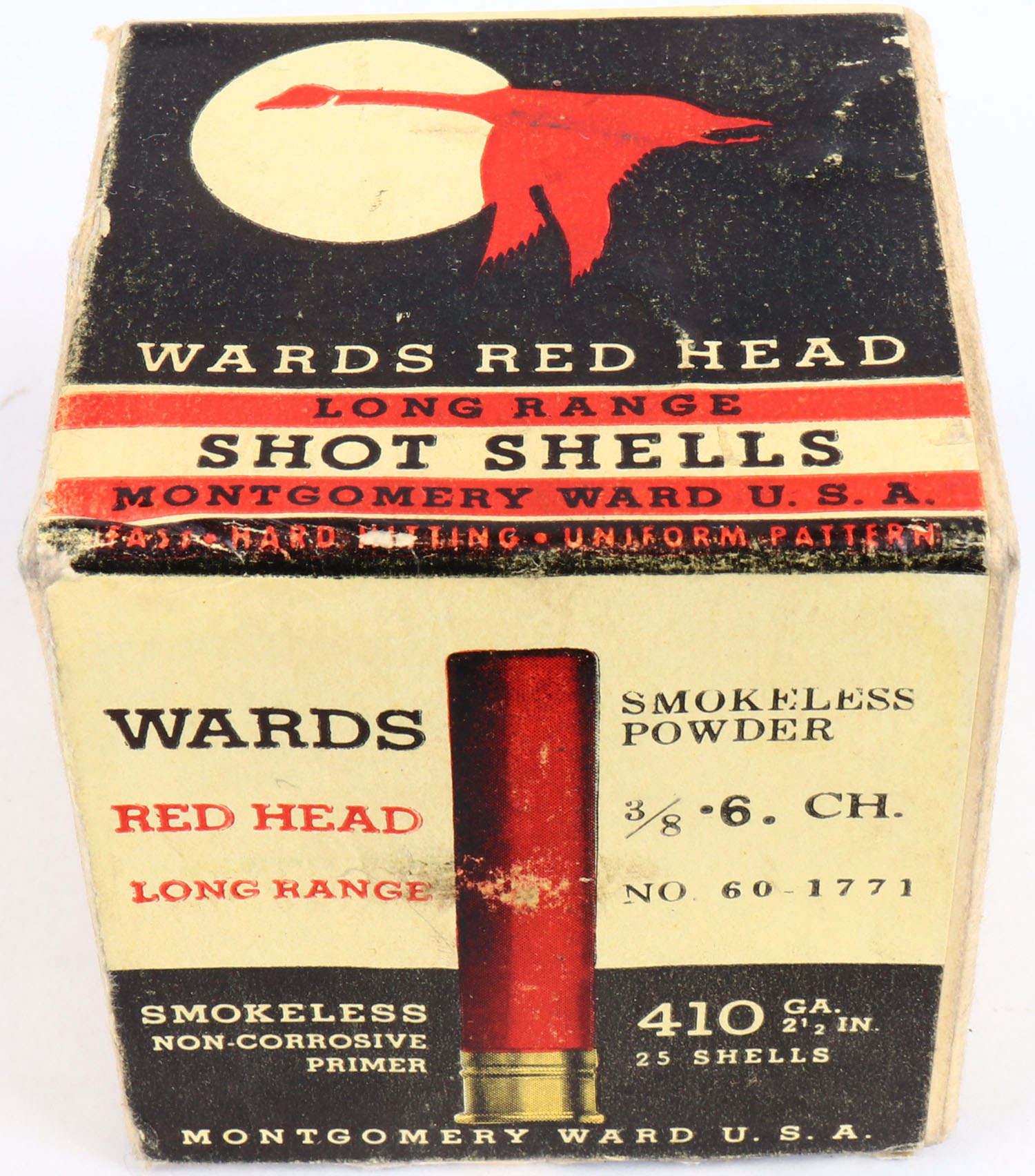 Montgomery Ward & Co., Red Head, 410ga., 2pc., Partial 24rds, shot size 6CH, black background with red goose flying through the moon, box has scuffing with great colors, Shells are excellent. Grade: Excellent + - Value: 40 to 120