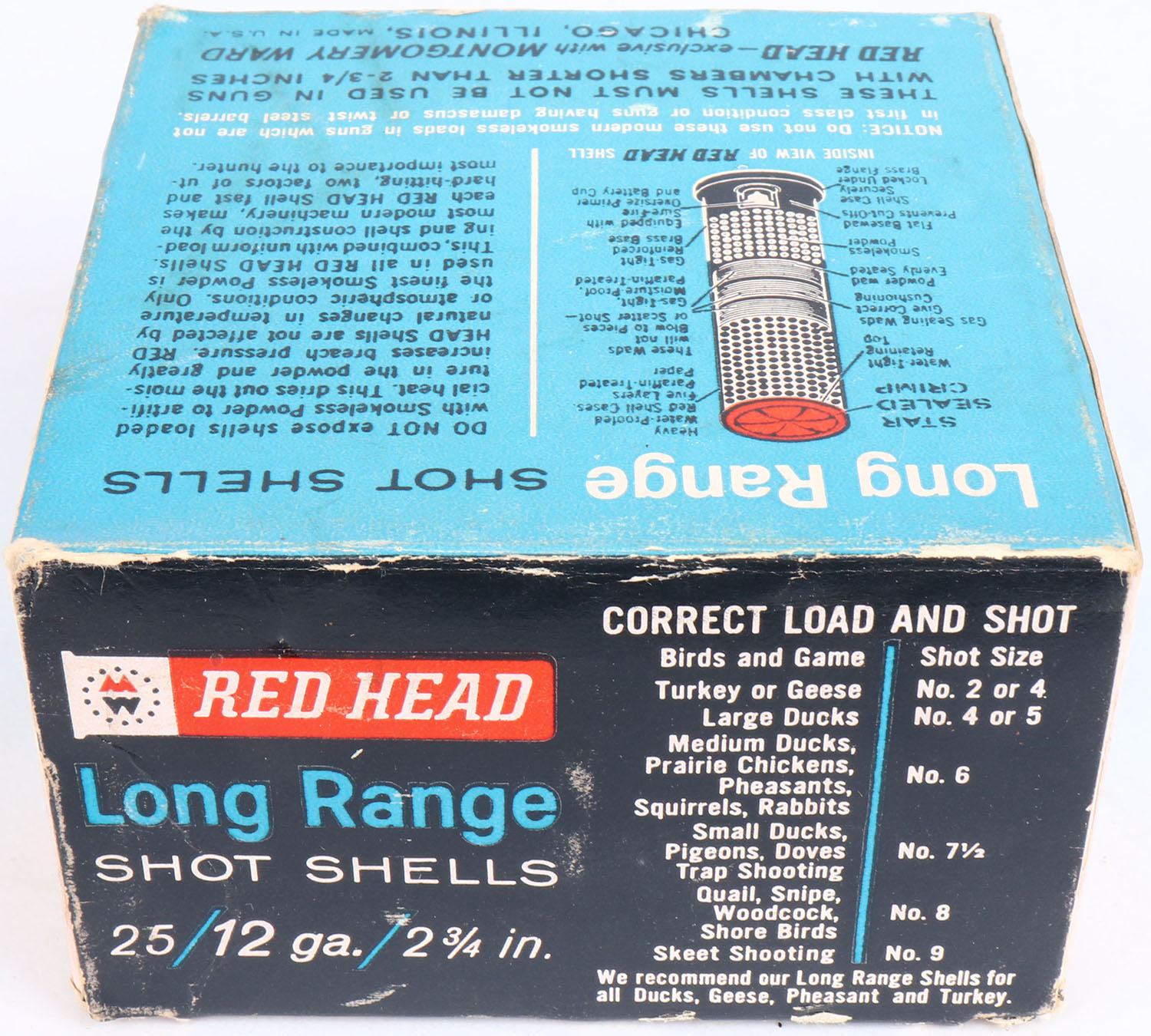 Montgomery Ward Red Head, 12ga., 1pc., Full, shot size 4, box is solid with very nice colors, shells are excellent. Grade: Excellent + - Value: 10 to 30