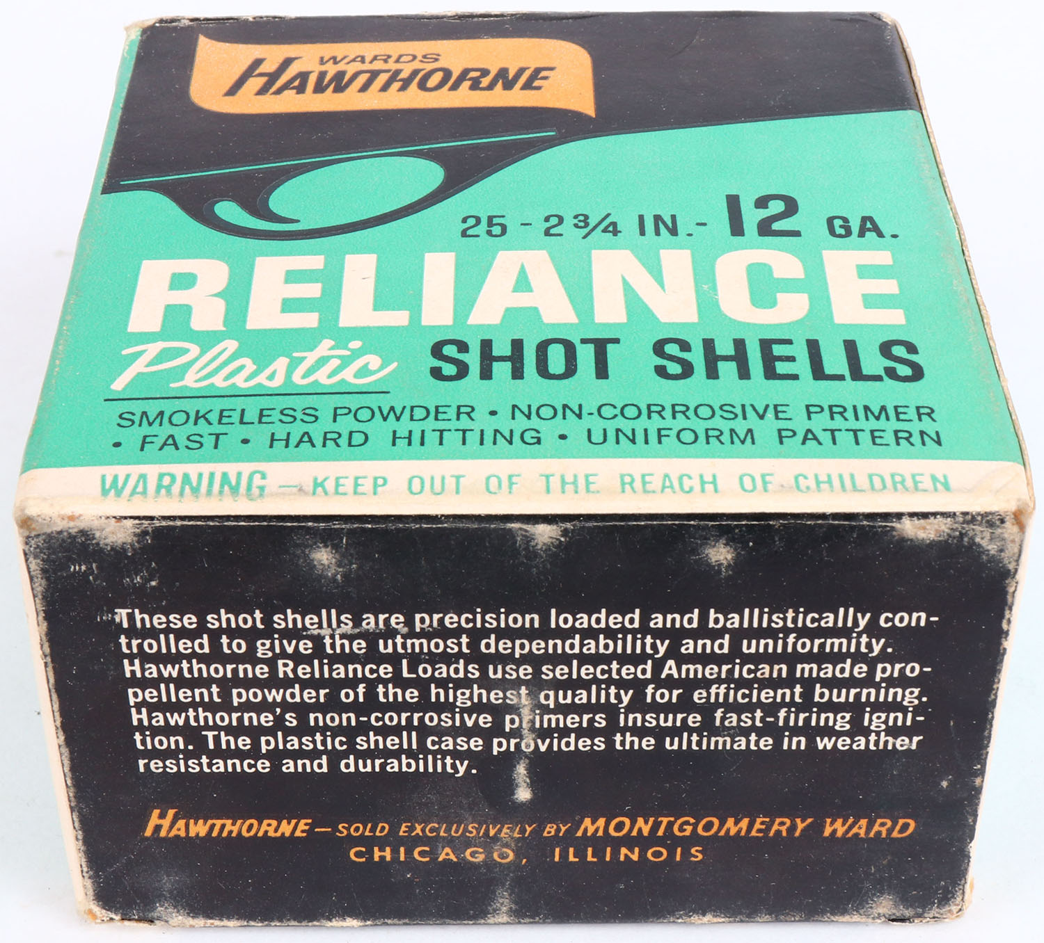 Montgomery Ward Hawthorne, 12ga., 1pc., Full, shot size 6, box is solid with very nice colors, shells are excellent. Grade: Excellent + - Value: 10 to 30