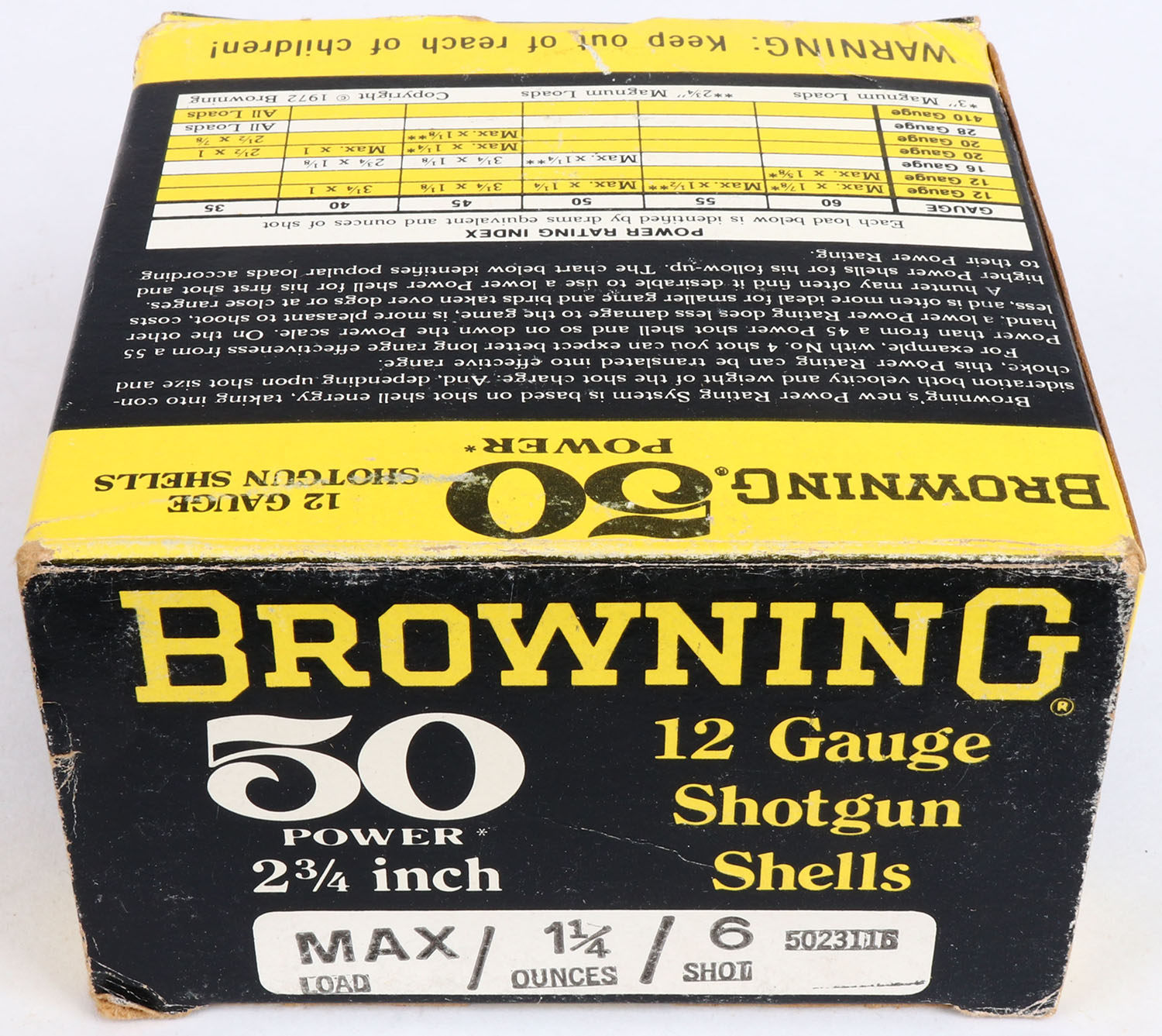 Browning, 50 Power, 12ga., 1pc., Full with 16rds being correct shot size, shot size 6, 2 3/4'', black, yellow & white box, box is solid with nice color, shells are excellent. Grade: Excellent - Value: 10 to 50