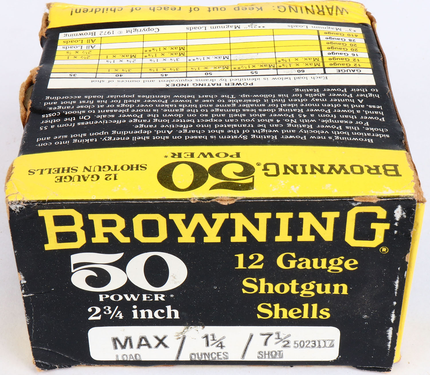 Browning, 50 Power, 12ga., 1pc., FULL, shot size 7 1/2, 2 3/4'', black, yellow & white box, box is solid with shell protrusion & nice color, shells are excellent. Grade: Excellent - Value: 20 to 60