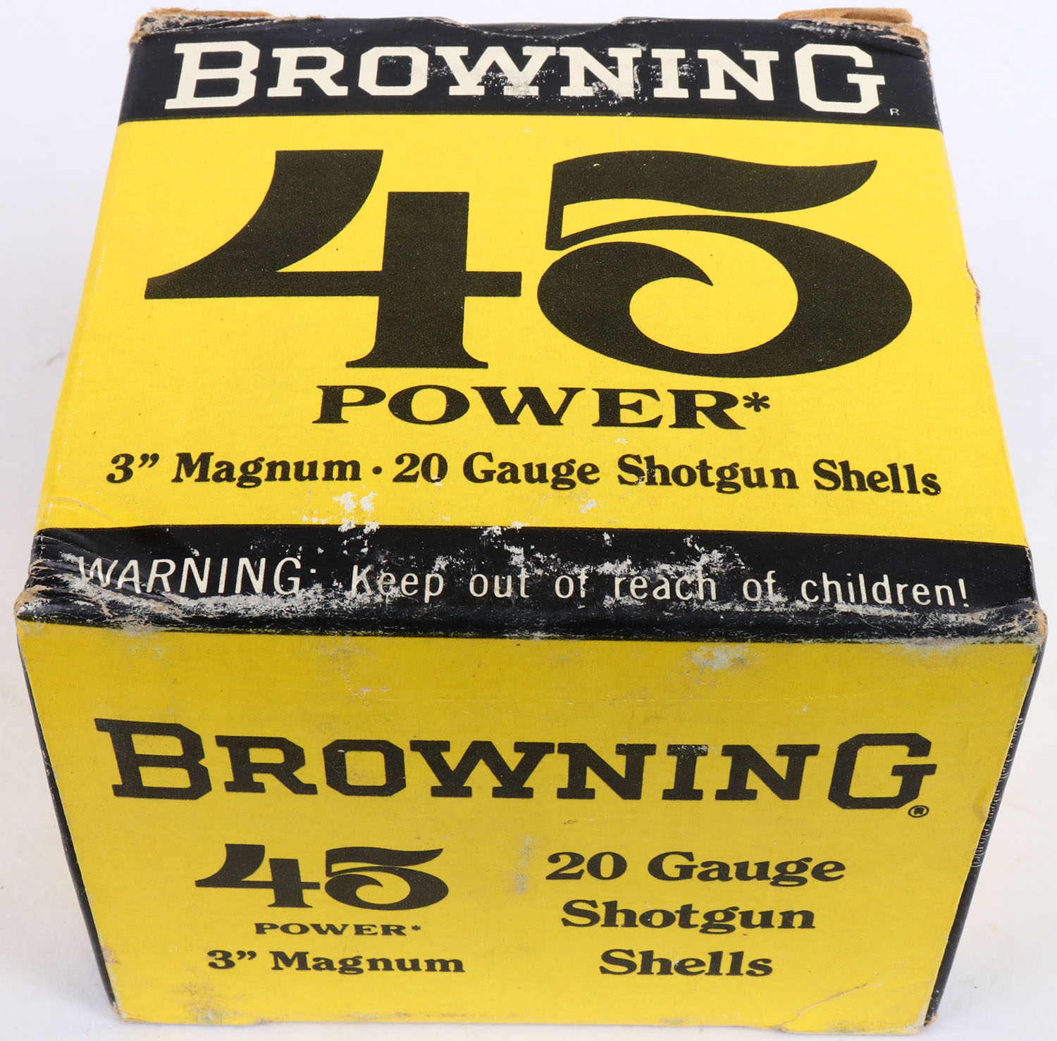 Browning, 45 Power, 20ga., 1pc., FULL, shot size 6, 3'', black, yellow & white box, box is solid with & great color, shells are excellent. Grade: Excellent - Value: 10 to 60
