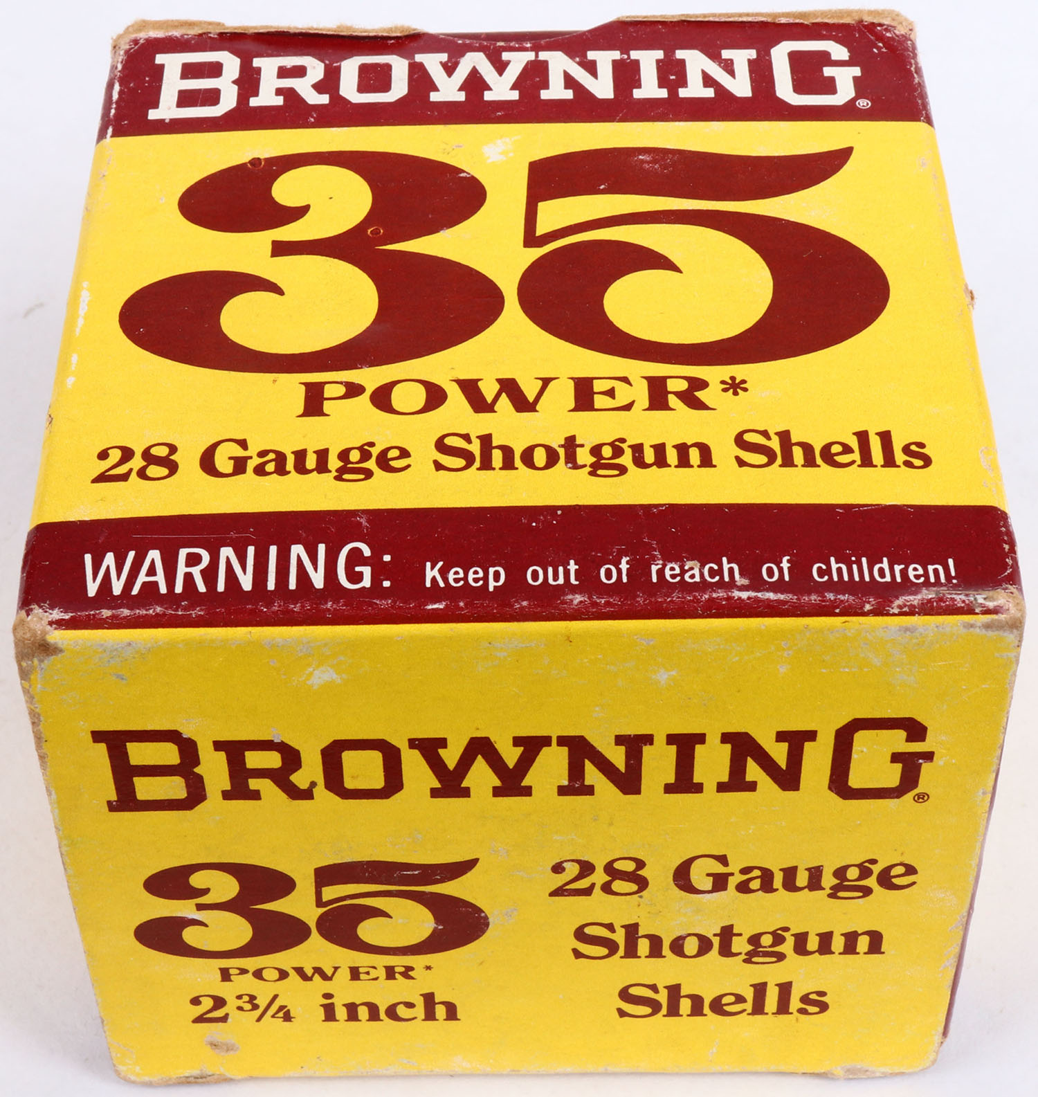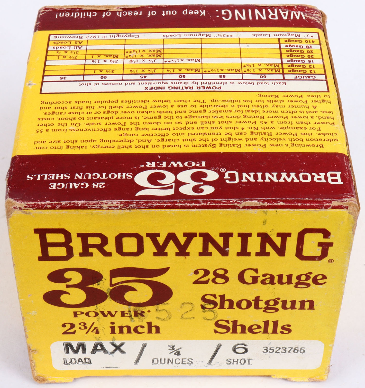 Browning, 35 Power, 28ga., 1pc., FULL, shot size 6, 2 3/4'', maroon, yellow & white box, box is solid with very nice color, shells are excellent. Grade: Excellent - Value: 20 to 60