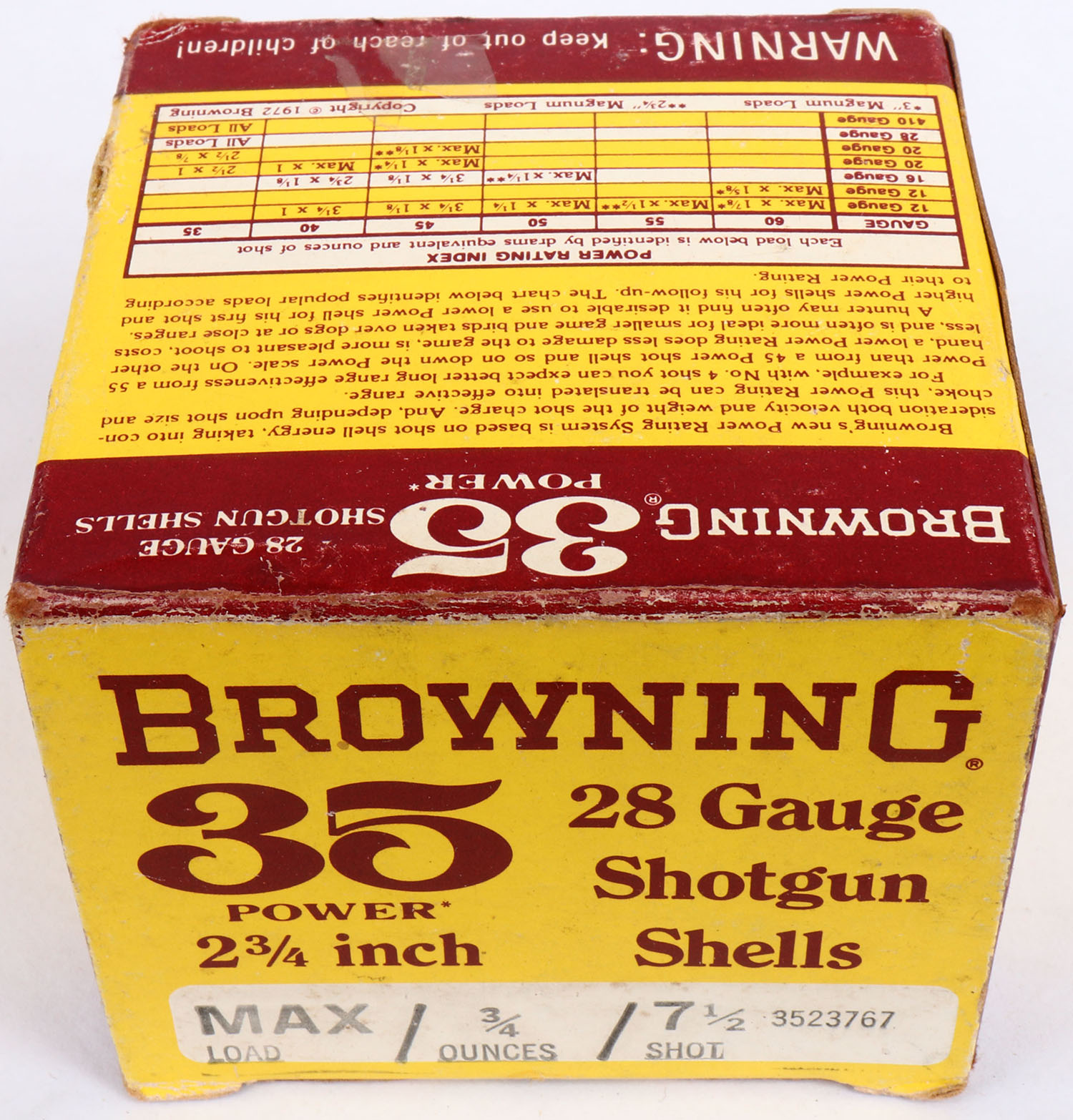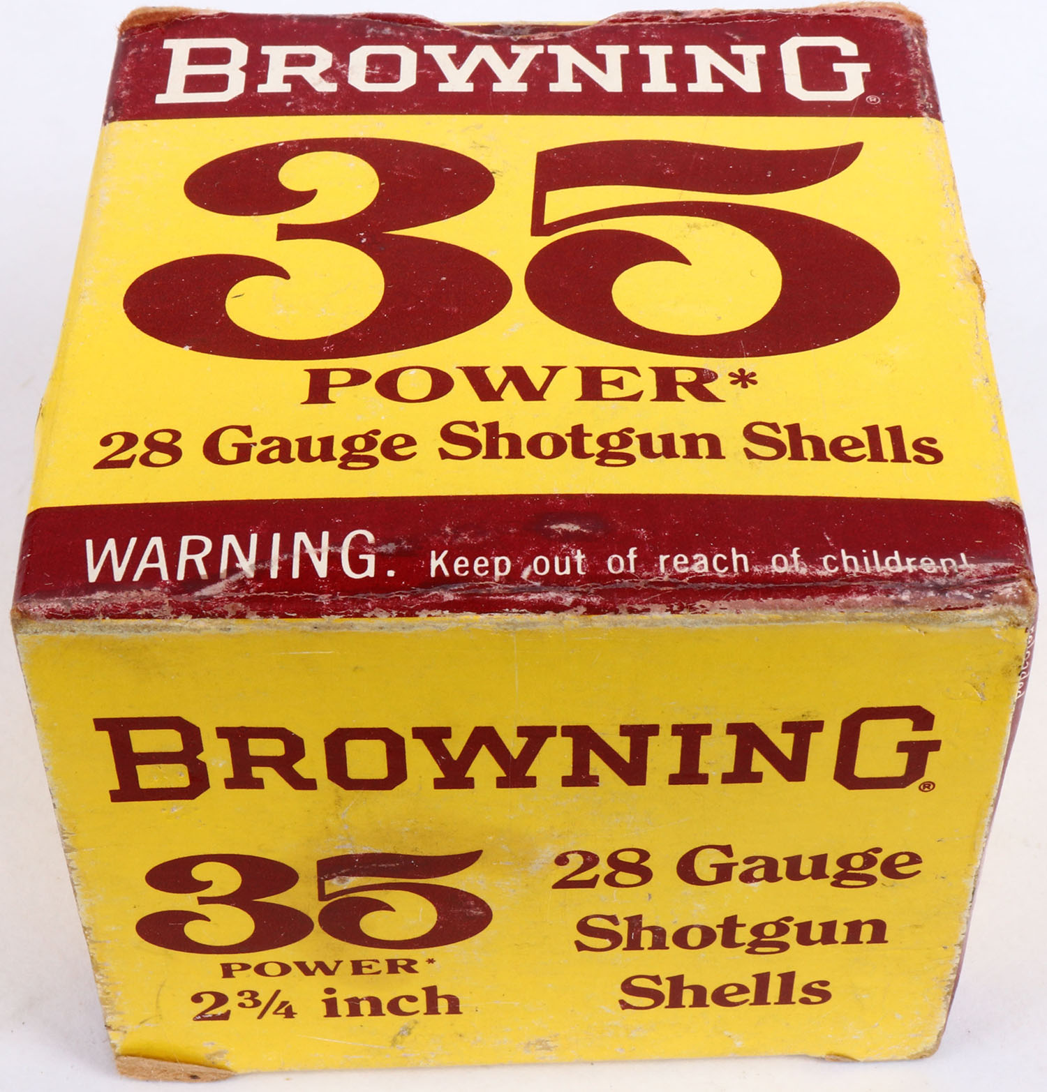 Browning, 35 Power, 28ga., 1pc., FULL, shot size 7 1/2, 2 3/4'', maroon, yellow & white box, box is solid with very nice color, shells are very good. Grade: Excellent - Value: 20 to 60