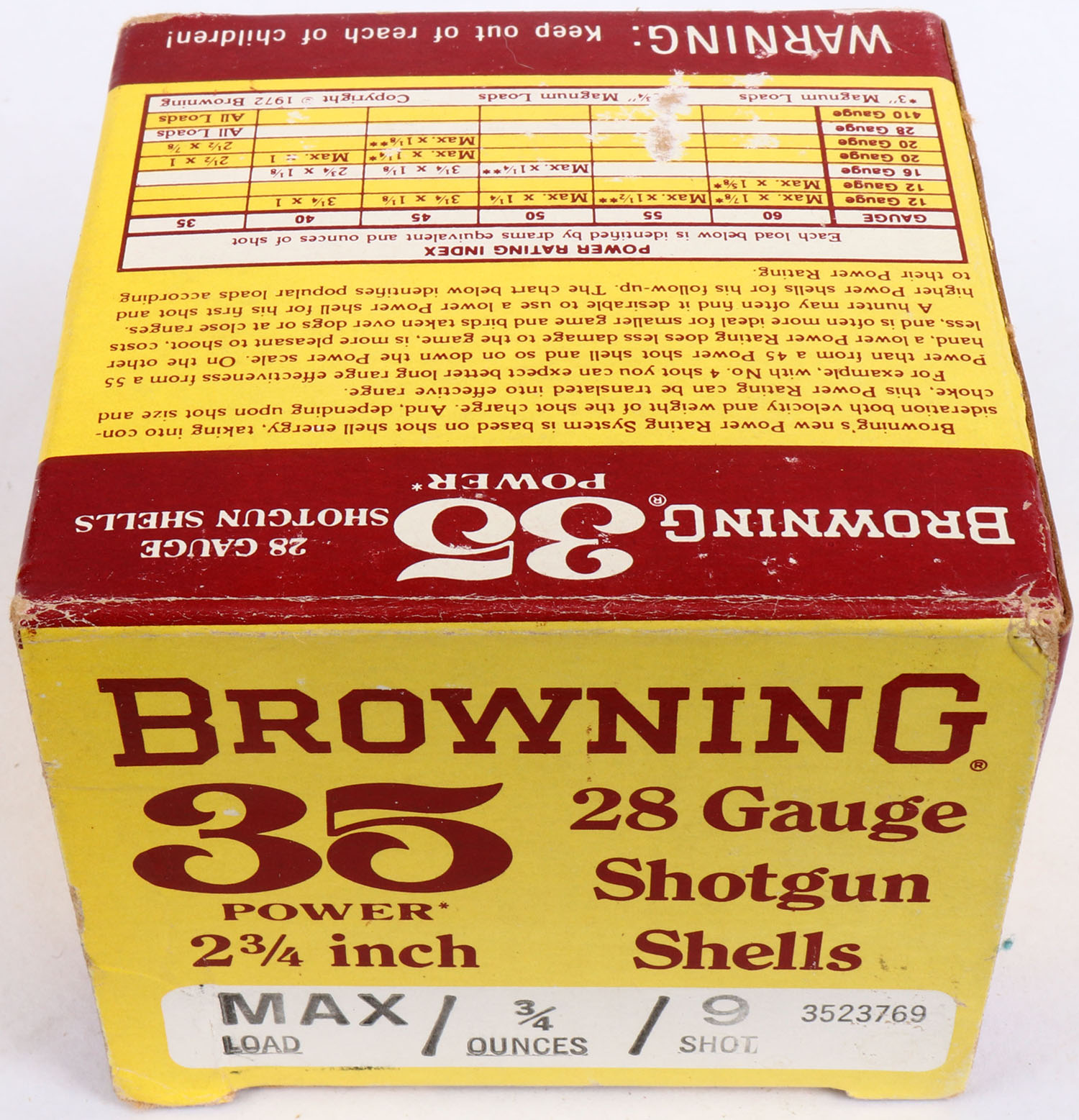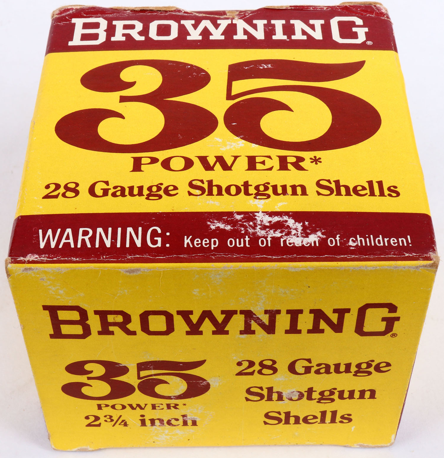 Browning, 35 Power with Acrylic box, 28ga., 1pc., Partial 24rds, shot size 9, 2 3/4'', maroon, yellow & white box, box is solid with very nice color, shells are excellent. Grade: Excellent - Value: 20 to 60
