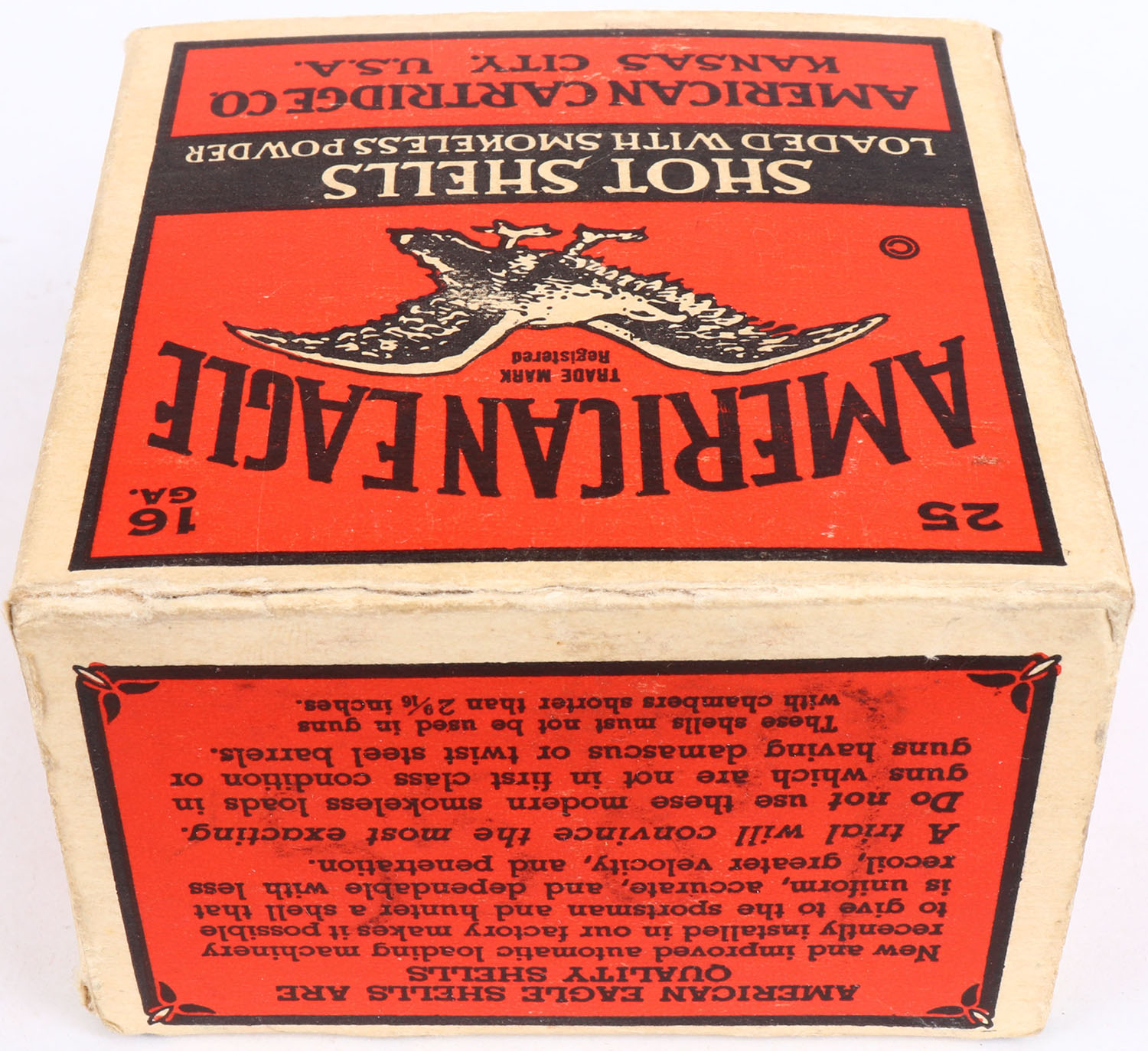 American Cart. Co., XL-Grade, 16ga., 1pc., Partial 13rds with 11rds being correct shot size, shot size 6, buff, red & black box that pictures a flying eagle, box is solid, has bottom flap almost disconnected with great colors, Shells are excellent. Grade: Excellent - Value: 30 to 100