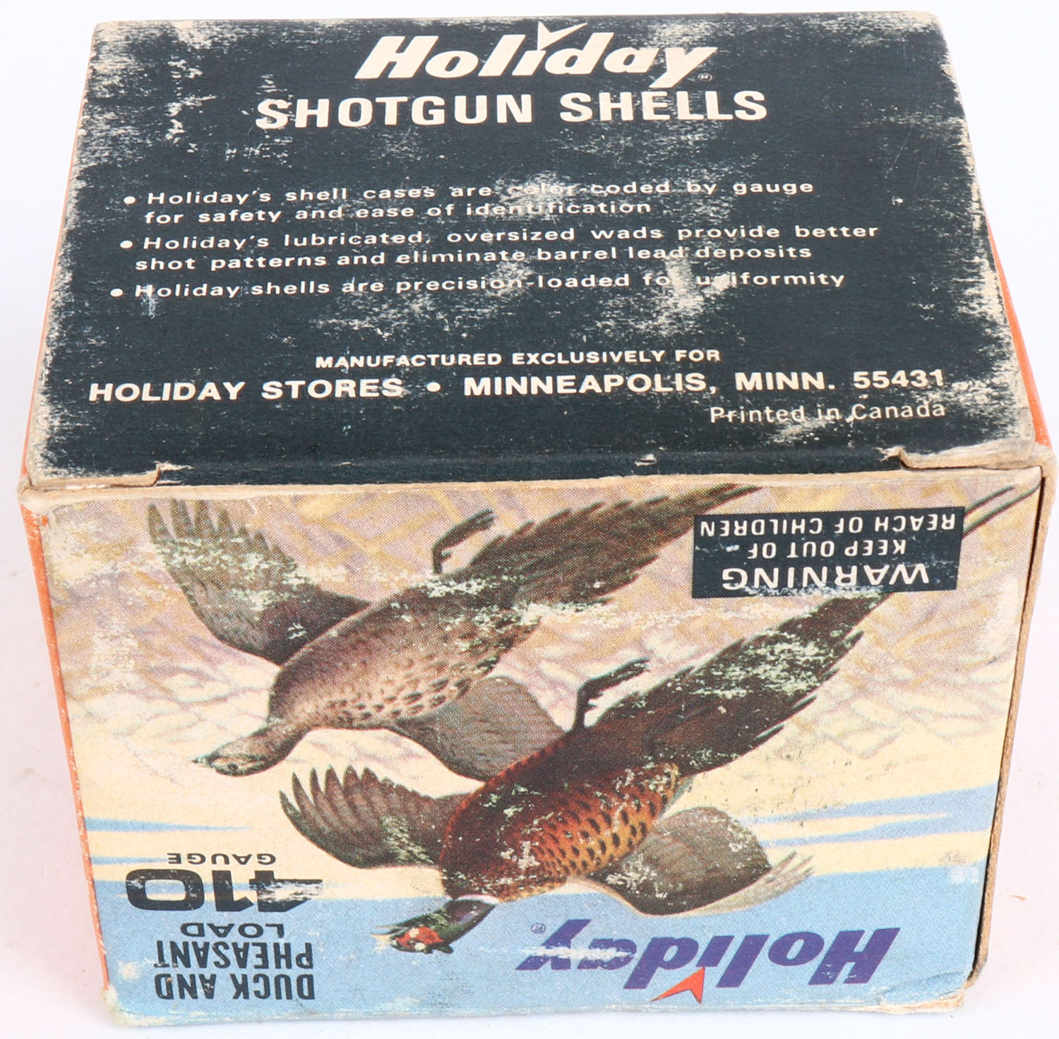 Holiday, Mallards/Pheasants, 410 GAUGE, 1pc., Partial 18rds of mixed shot size, 3'', shot size 7 1/2, multi color graphics by Les Kouba, box is solid with great colors, scuffing & inside flap has torn piece, Shells are excellent. Grade: Excellent - Value: 50 to 200