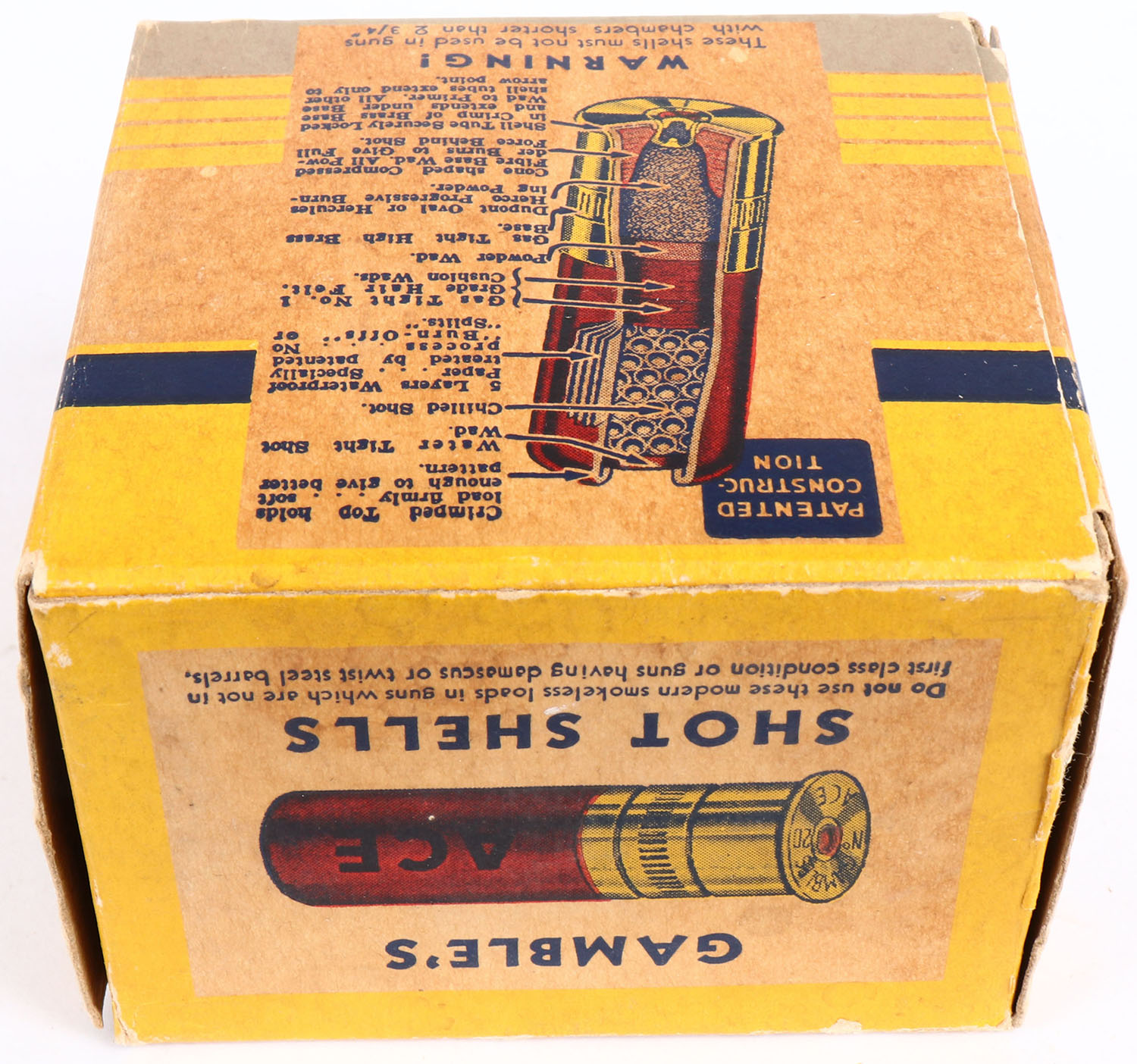 Gambles, ACE Shot Shells, 20ga., 1pc., Empty, shot size 6, buff, blue, yellow & grey box, box has light age soiling and has inside flap almost disconnected with great colors. Grade: Excellent - Value: 20 to 80