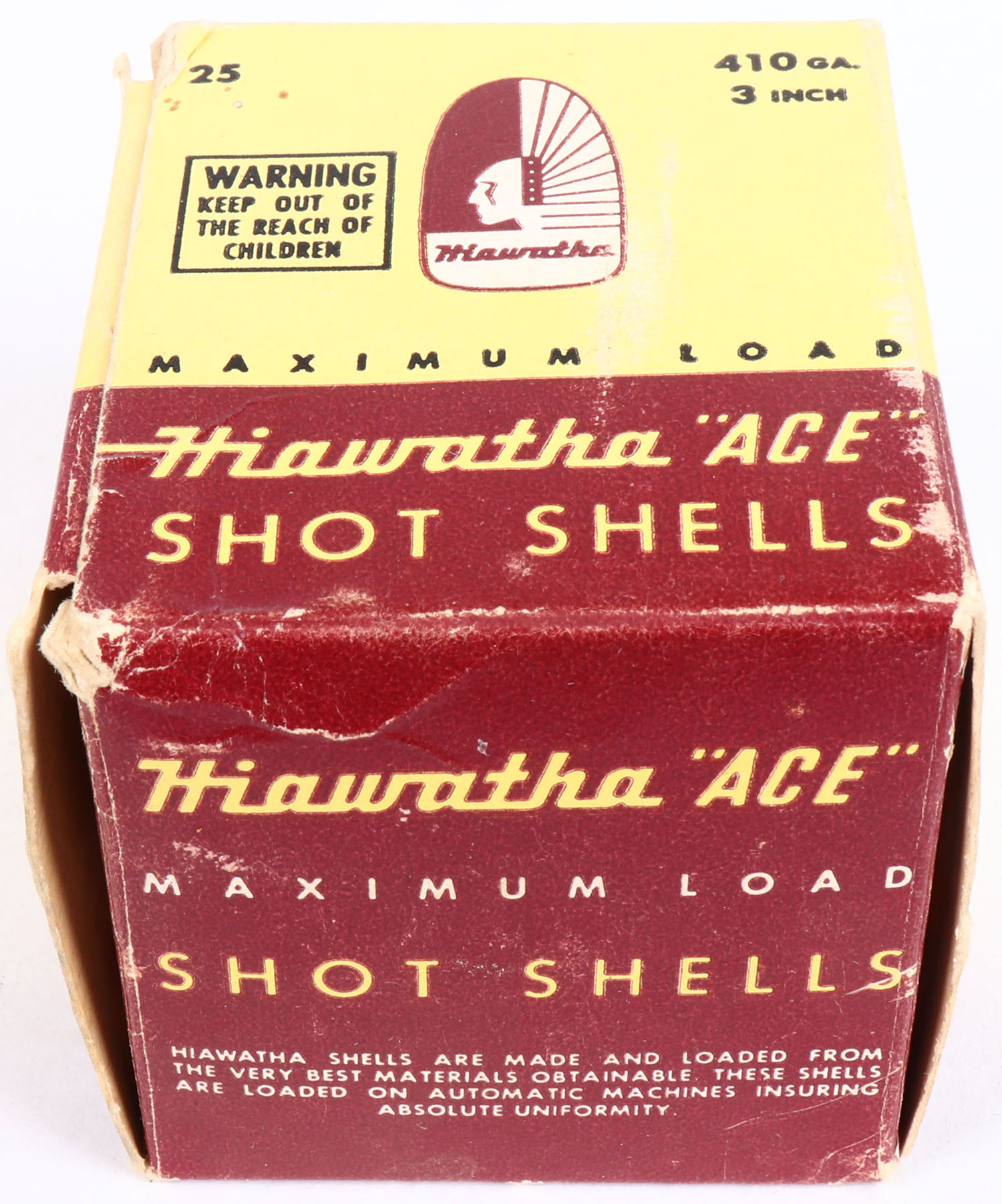 Gambles, Hiawatha Paper Shells, .410ga., 1pc., Partial 13rds., shot size 4, yellow, maroon & white box, box is solid with great color, shells are excellent. Grade: Excellent - Value: 6 to 20