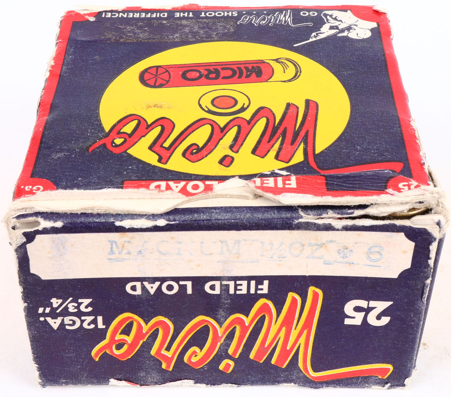 Micro, Field Load, 12ga., 1pc., Partial 15rds, shot size 6 Magnum multi-colored box, box is very solid with edge wear, shells are excellent. Grade: Excellent + - Value: 8 to 20